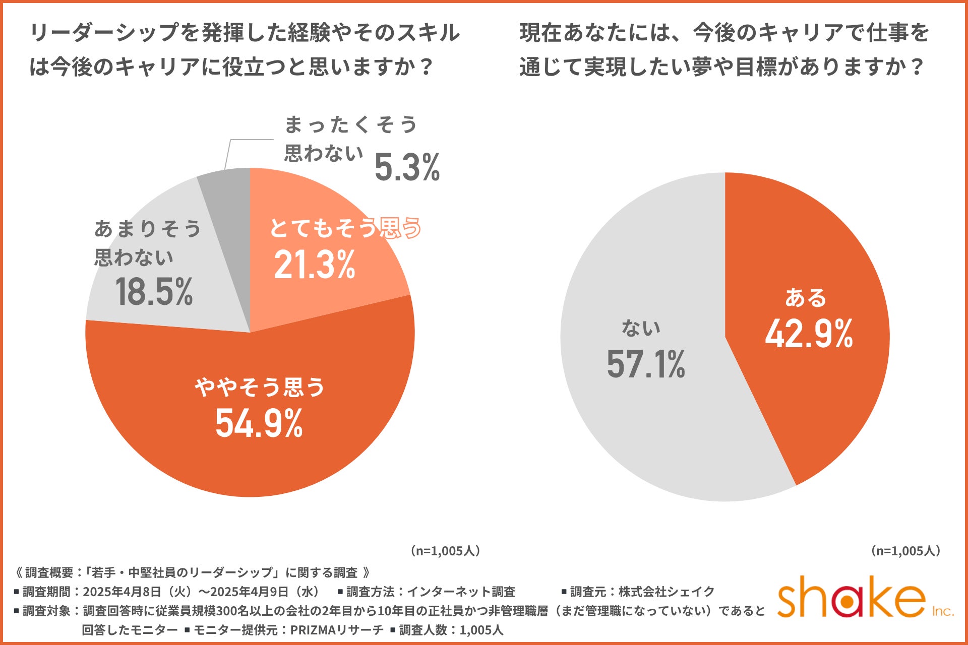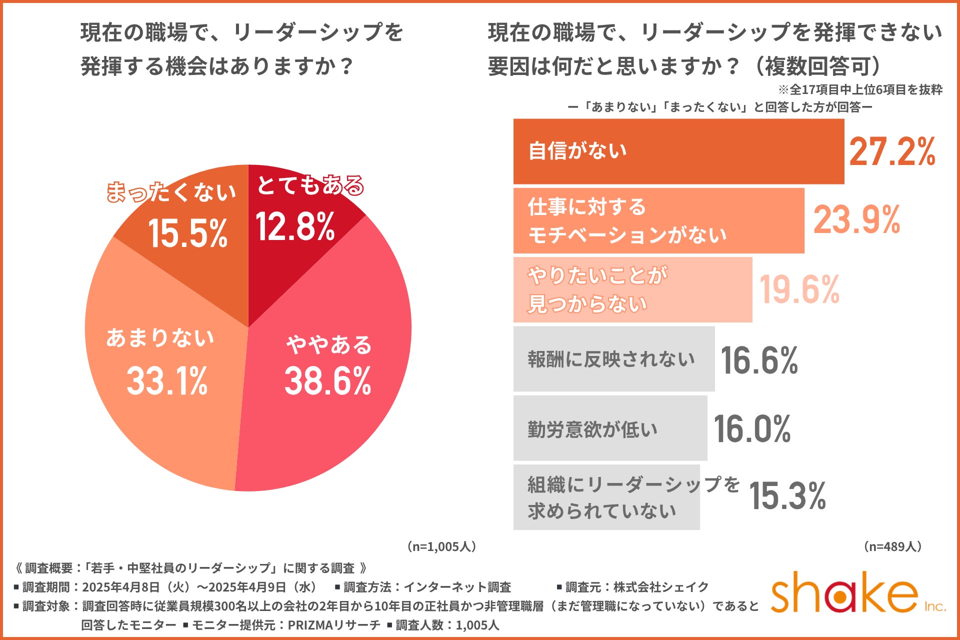 今回、株式会社シェイク(https://shake.co.jp/)は、従業員規模300名以上の会社の2年目から10年目の正社員かつ非管理職層(まだ管理職になっていない)の方を対象に、「若手・中堅社員のリーダーシップ」に関する調査を実施しました。