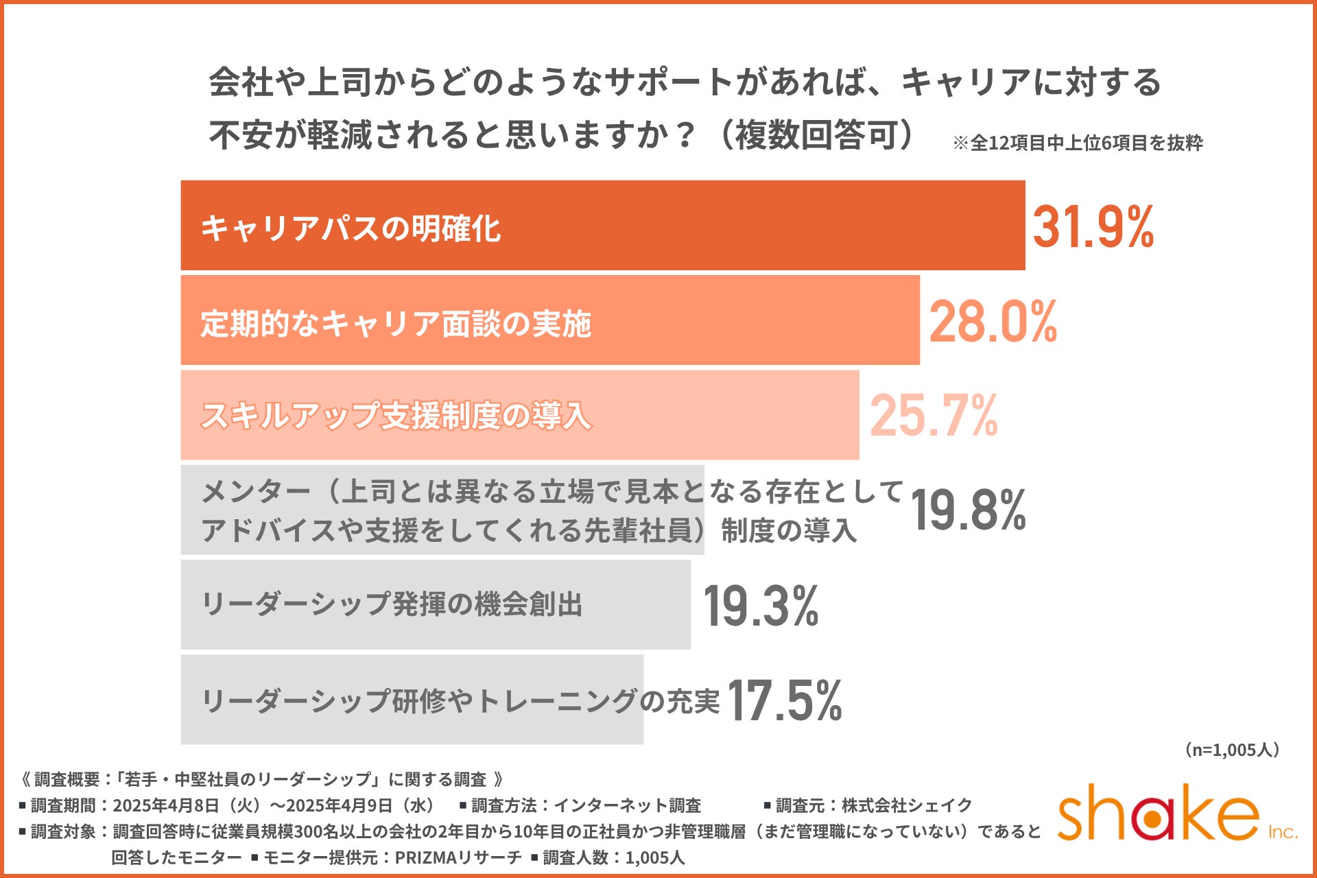 「会社や上司からどのようなサポートがあれば、キャリアに対する不安が軽減されると思うか」と尋ねたところ、『キャリアパスの明確化(31.9%)』『定期的なキャリア面談の実施(28.0%)』『スキルアップ支援制度の導入(25.7%)』が上位となりました。