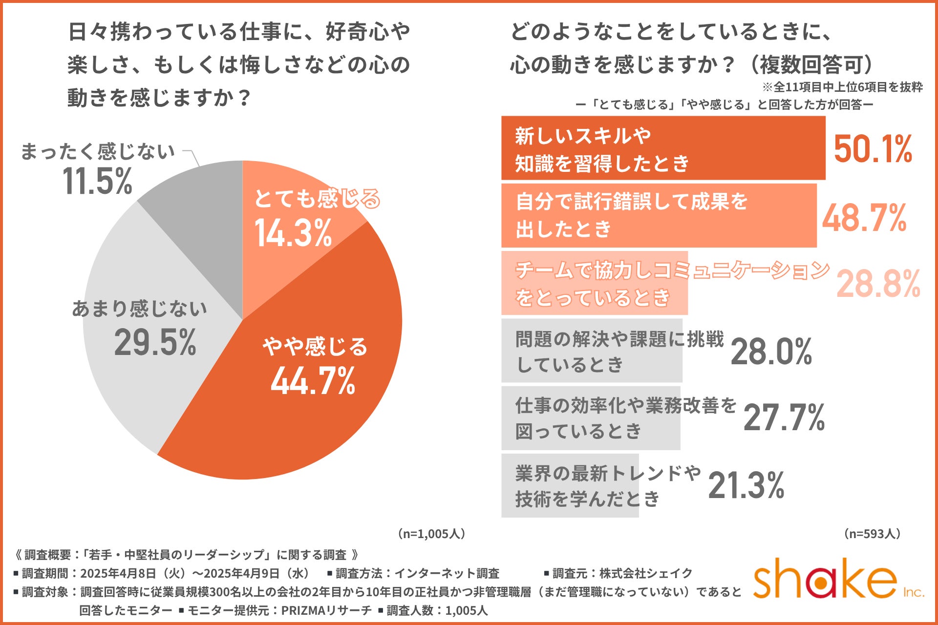 さらに、前の質問で『とても感じる』『やや感じる』と回答した方に「どのようなことをしているときに、心の動きを感じるか」と尋ねたところ、『新しいスキルや知識を習得したとき(50.1%)』『自分で試行錯誤して成果を出したとき(48.7%)』『チームで協力しコミュニケーションをとっているとき(28.8%)』となりました。
