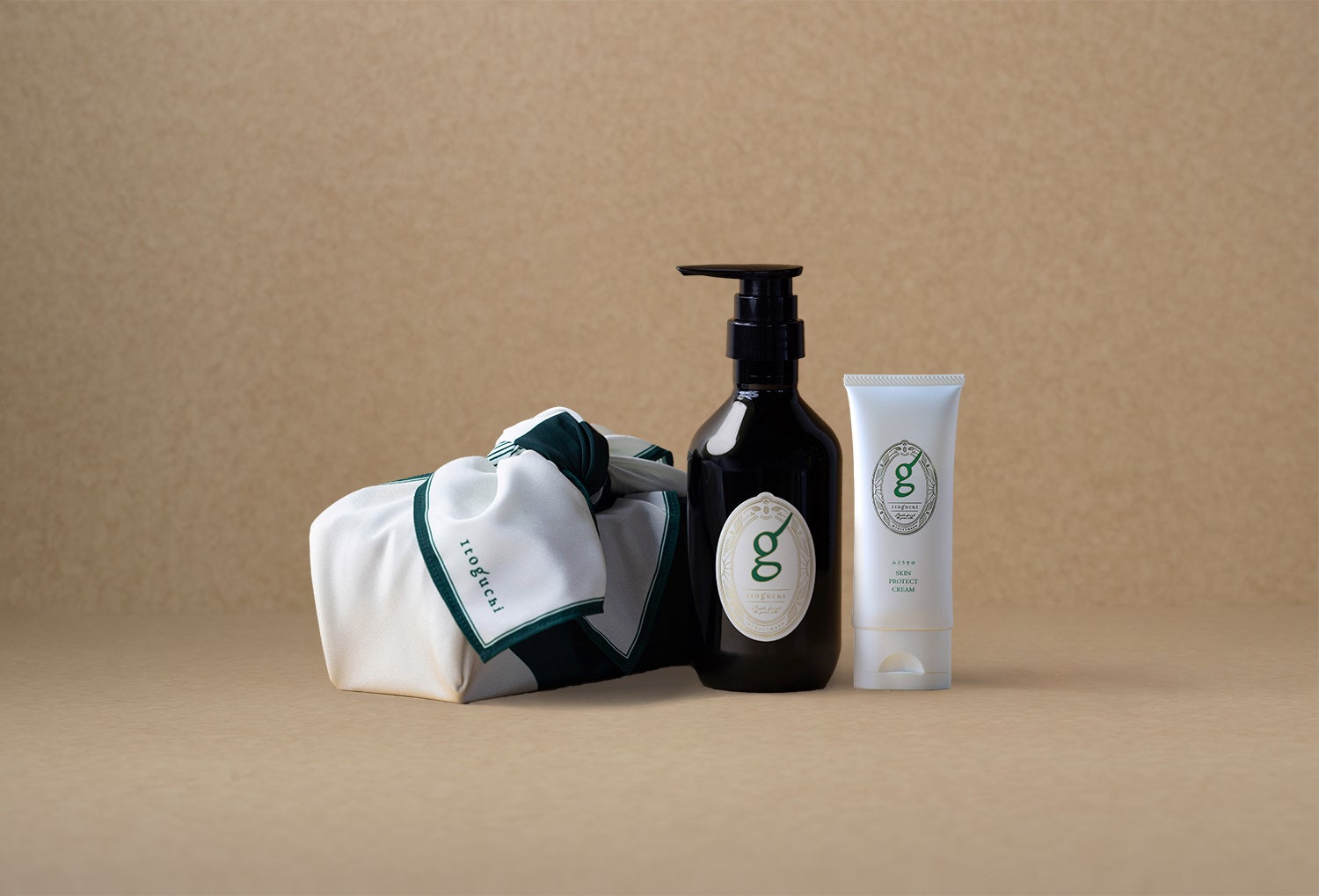 全身を1本でしっとりと洗い上げる「モイストシャンプー」と、乾燥肌の保湿から花粉や微粒子汚れなどからくる揺らぎ肌の保護まで、マルチにお役立ていただける「スキンプロテクトクリーム」を、Itoguchiのオリジナルフロシキでラッピングしました。
