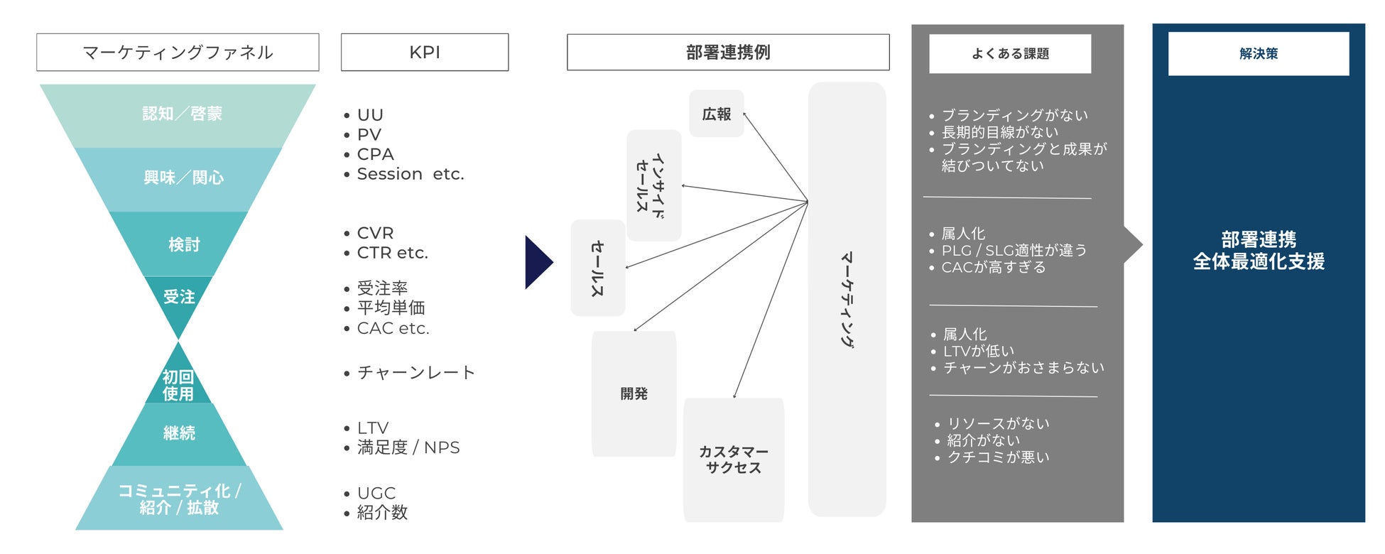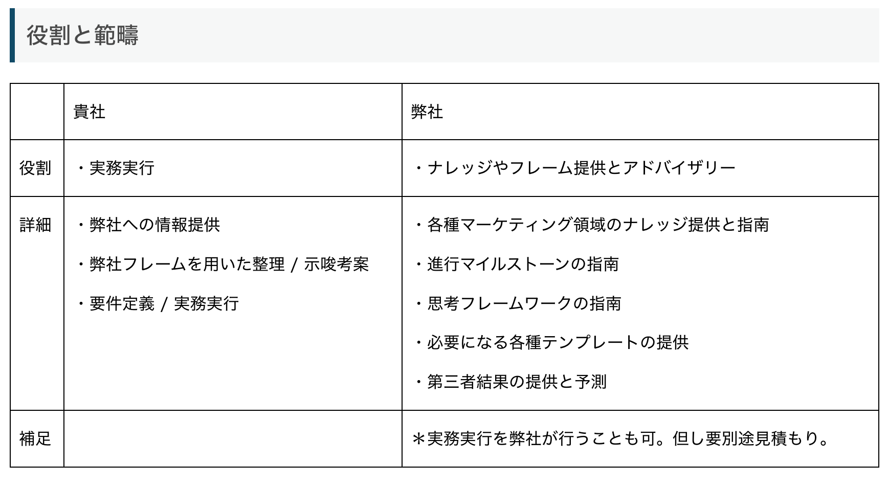 マーケティング領域の上流から下流まで包括してプロジェクトマネジメントを実施する会社です。インハウス化で上流から一気通貫・体制構築・施策実施します。マーケティング全般の施策介入 / 組織横串を差す支援経験が多く、THE Model的な支援が可能な特徴があります。