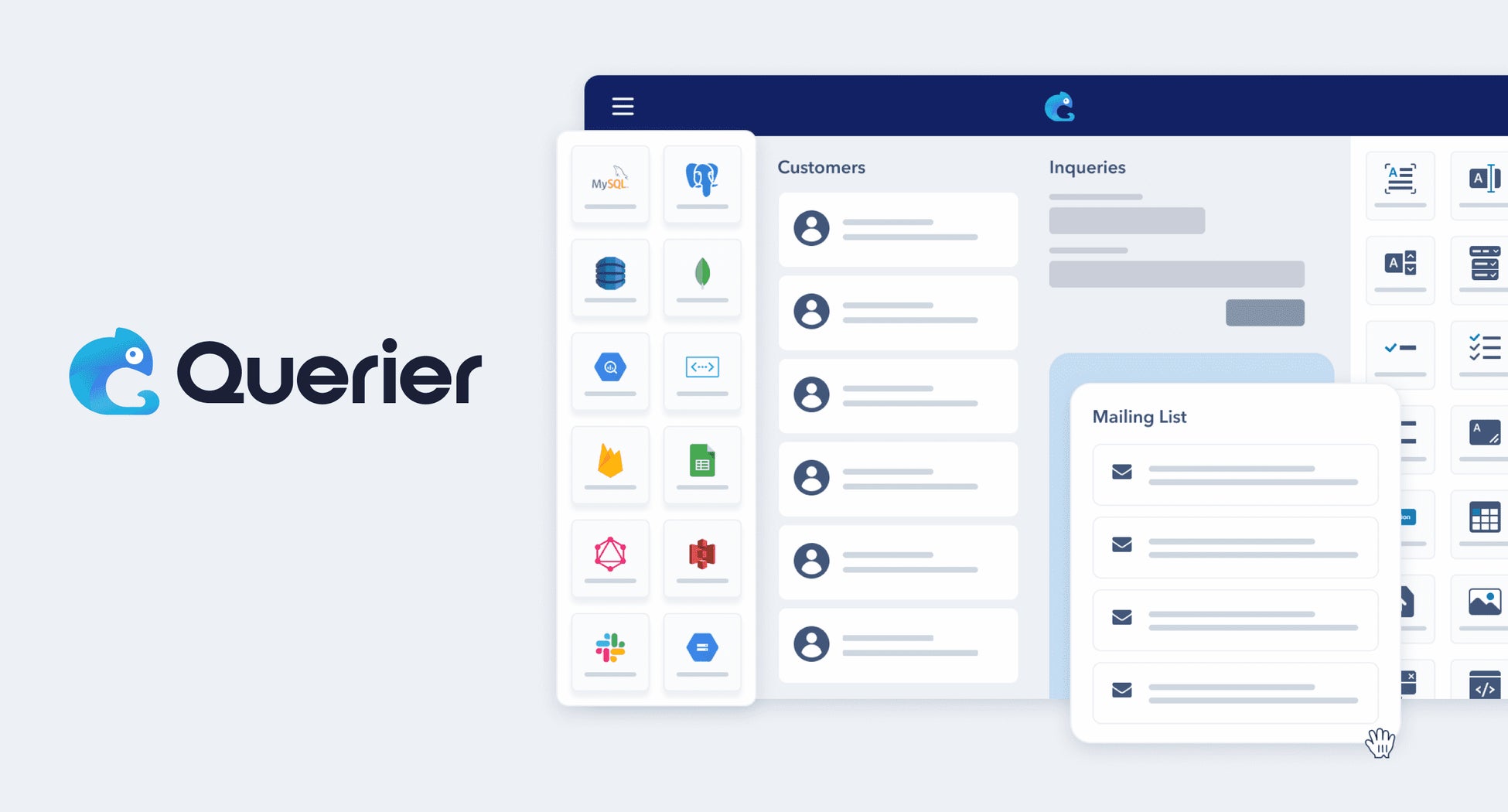 管理画面や基幹システム、業務システムに必要なフロントエンドのパーツをあらかじめ用意しています。これらのパーツをドラッグアンドドロップするだけで、簡単に画面を作成できるため、複雑なコーディングは不要です。さらに、複数のクエリを組み合わせることで、複雑なロジックもシンプルに作成・管理が可能です。このため、フロントエンドの開発が非常に簡単で、利用者の要望にも柔軟に対応して迅速にアップデートできるうえに、新しい管理画面もすぐに用意することが出来ます。