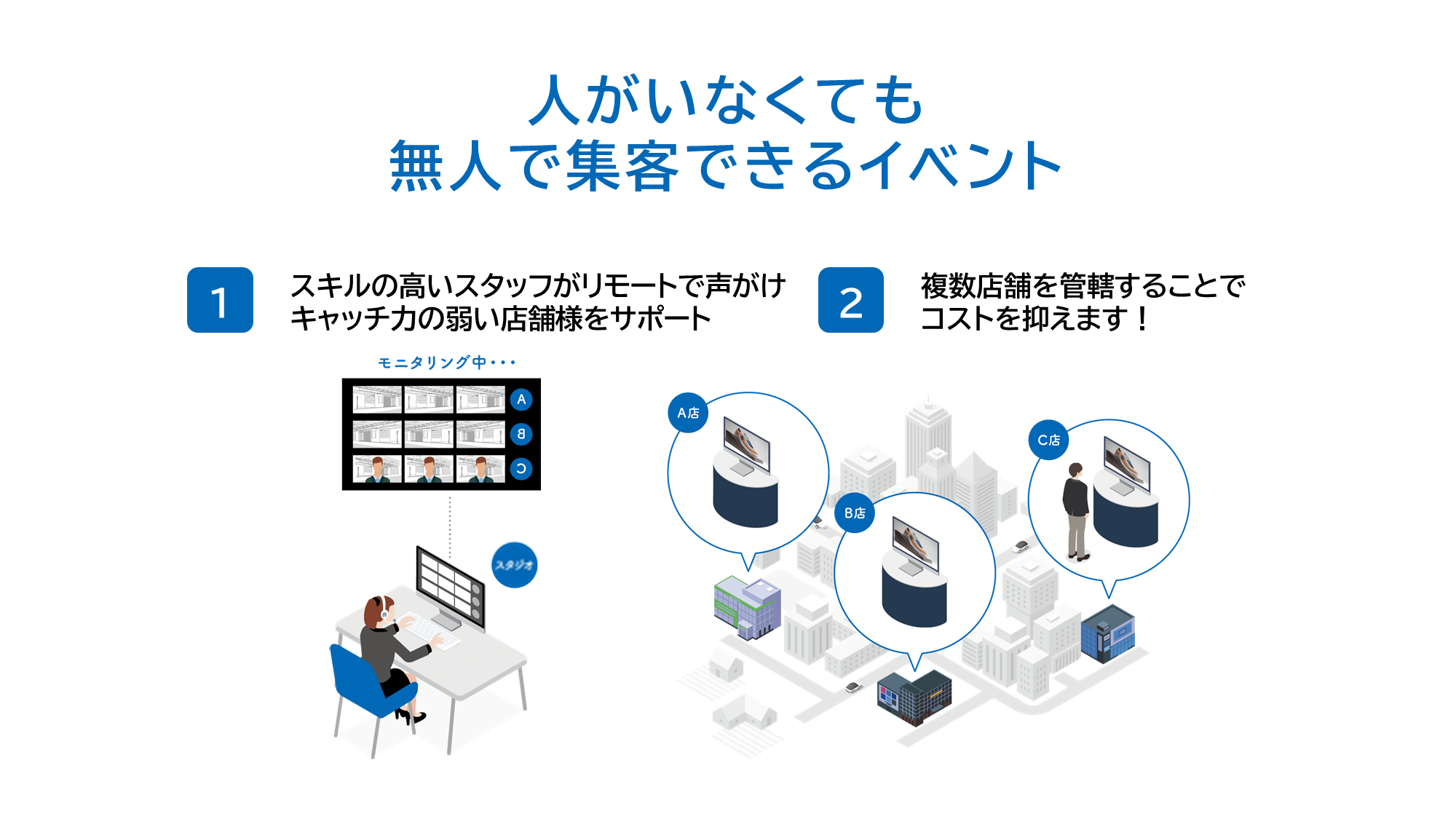 イベントスタッフが集客のために長時間立って呼び込みを行うという負担がなくなるほか、複数店舗のイベント集客をリモートで同時に対応することもできるため、人件費の削減にも繋がります。