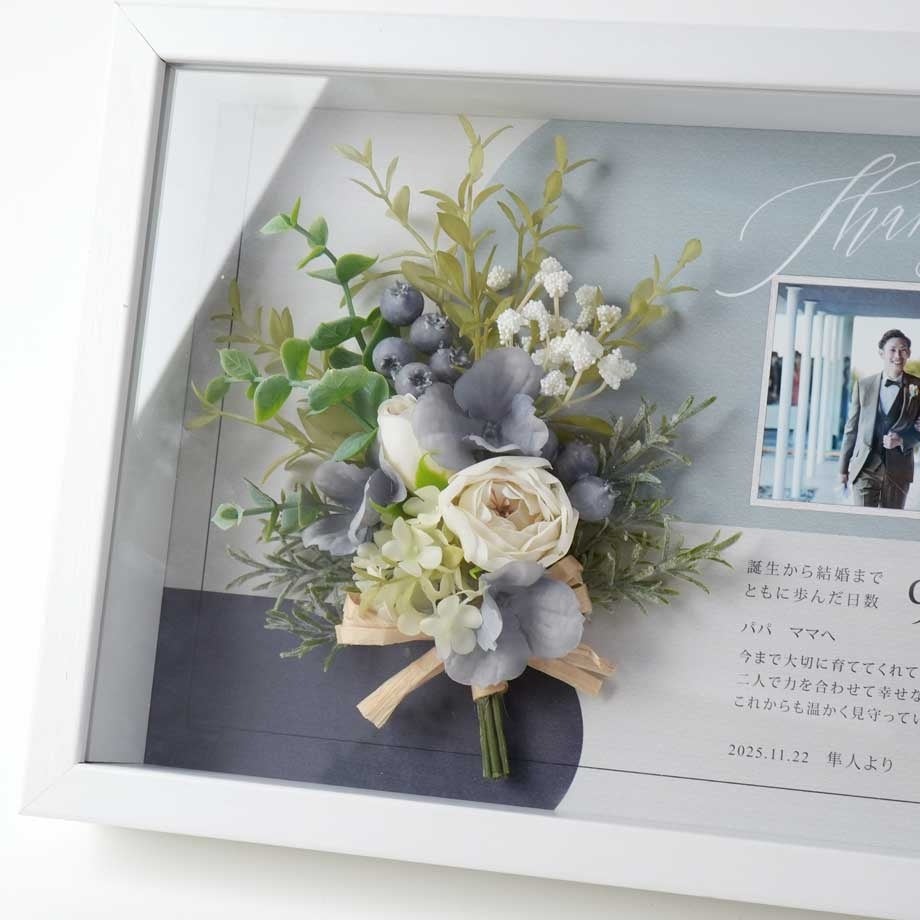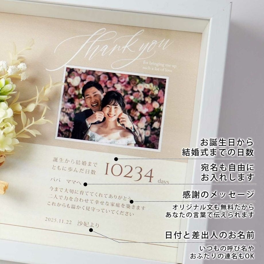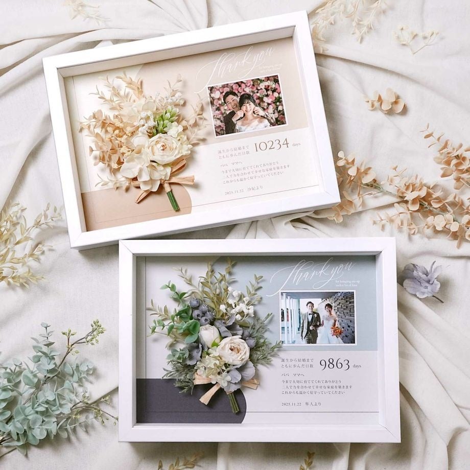 写真は縦横どちらの向きにも対応。誕生から結婚までをカウントした日数はもちろん、感謝のメッセージも定型文から選べるほか、ご自身の言葉で伝えられるオリジナル文にも無料で対応しています。ひとつひとつ丁寧に手作りし、世界にひとつだけの特別なギフトに仕上げていきます。