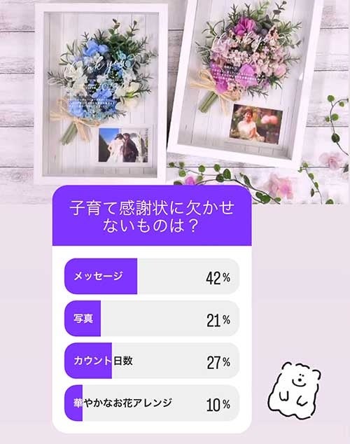 直接感謝の気持ちを伝えられる「メッセージ」は欠かせないと思っている方が4割と一番多かったですが、「写真」「カウント日数」「お花アレンジ」も少しバラツキはあるもののそれぞれに票が入っており、どの内容も満遍なく入った子育て感謝状であれば、全ての花嫁さんのニーズにかなうバランスの良いギフトアイテムになるのでは?と、このたびの新作開発に至りました。