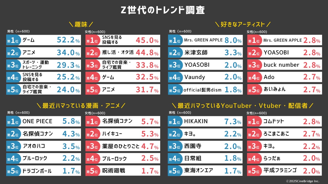 好きなアーティストは男女ともに『Mrs. GREEN APPLE』が第1位に。近年はZ世代からの圧倒的な支持を集めるトップアーティストの楽曲が、アニメ主題歌や映画主題歌として戦略的に起用される事例が増えています。映像と音楽による相乗効果も、Z世代の心を惹きつける大きな要因となっています。