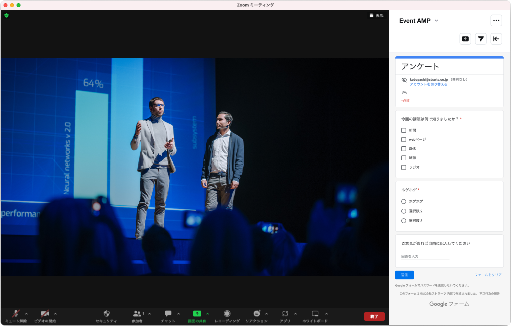 一方、基本的にオンライン配信や画面共有がメインのZoomでは、表示したい情報が限定される課題があります。