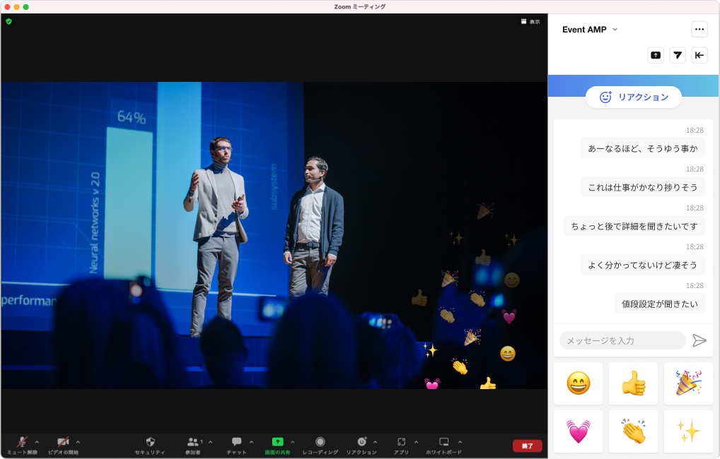 拍手音付きのリアクションボタンで臨場感アップ。音声を出す/出さないの切り替えは主催者様が任意のタイミングで行えます。