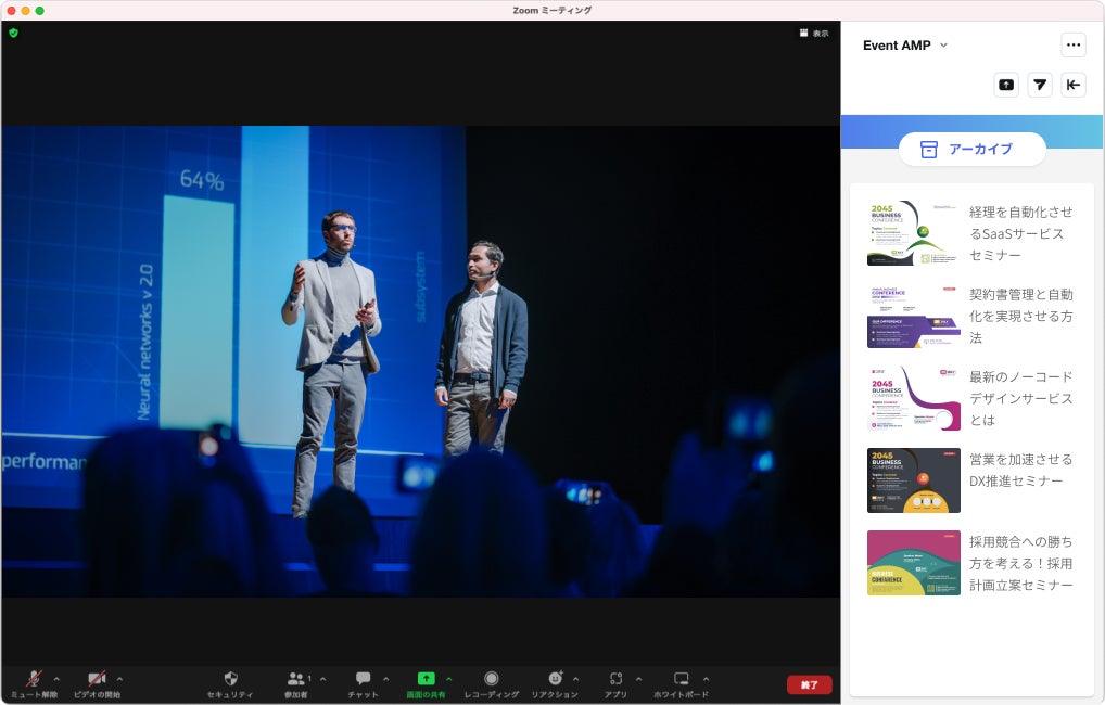 Zoomの画面でアーカイブ配信や視聴ログの取得が可能に。Zoomの配信URLをそのまま利用できるため、後から見たい場合も1クリックでご案内できます。