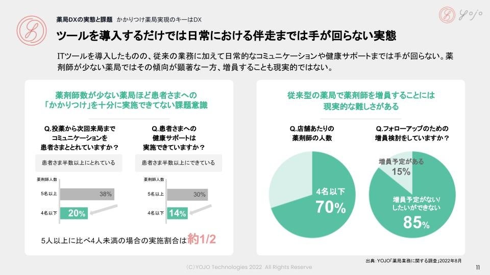 ITツールを導入したものの、従来の業務に加えて日常的なコミュニケーションや健康サポートまでは手が回らない。薬剤師数が少ない薬局ではその傾向が顕著な一方、増員することも現実的ではない。