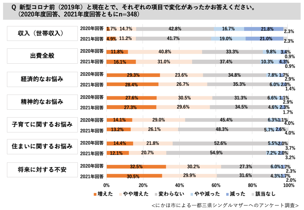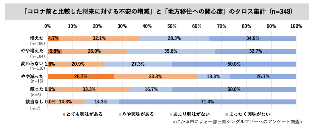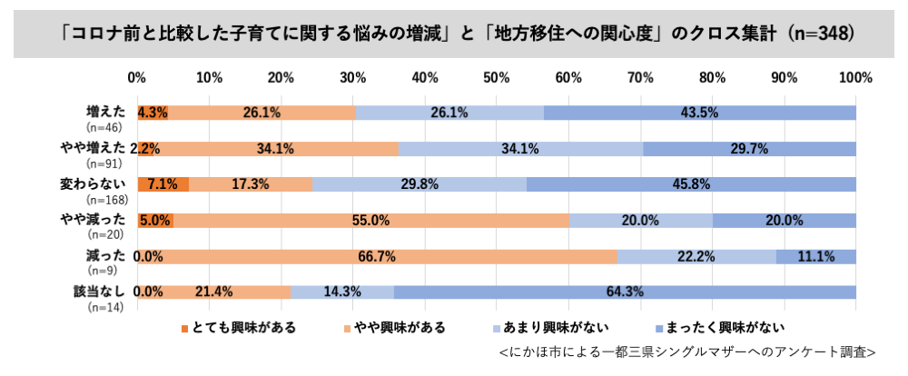 秋田県にかほ市による一都三県シングルマザー調査:コロナ禍における経済的・精神的な悩みは引き続き増加、一方で悩みが減った人ほど地方移住への関心度が高い傾向