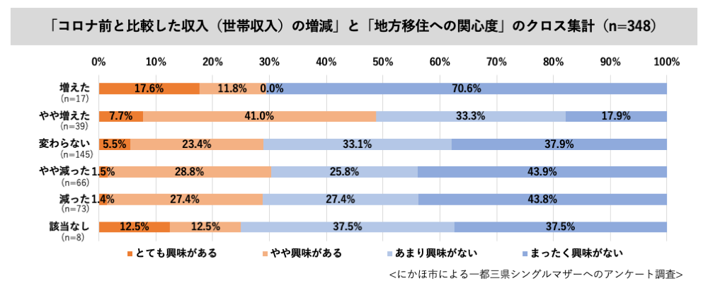 秋田県にかほ市(市長・市川 雄次)は、一都三県在住のシングルマザーを対象に、地方移住への関心度やコロナ禍における状況変化を把握するための意識調査を昨年度に続いて実施しました。コロナ前と比較し、経済面を含めた様々な悩みの増加が引き続き顕著である一方で、収入が増えた、または悩みが減った人ほど地方移住への関心度が高いことが明らかになりました。