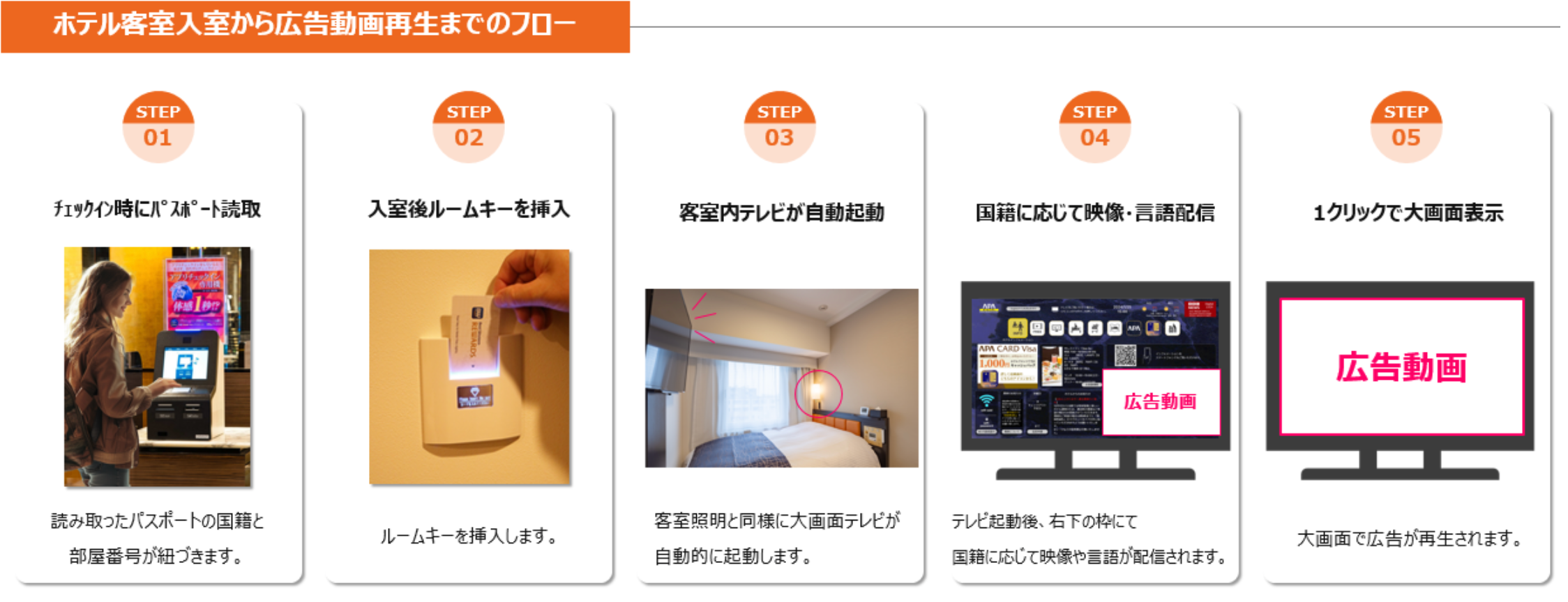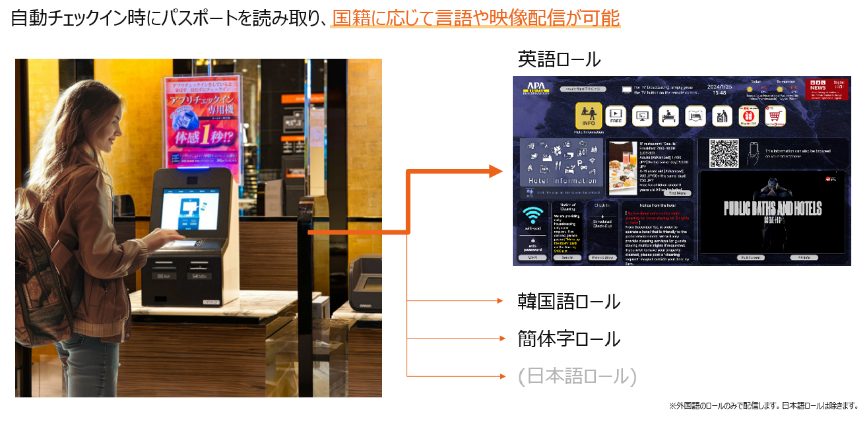 ホテルチェックイン時に提示するパスポートの国籍と客室番号が紐づけられます。宿泊客が客室に入室してカードキーを挿入すると、客室の照明とともにテレビが自動的に立ち上がり、パスポートの国籍に応じた映像や音声・テロップ(言語)が配信されます。