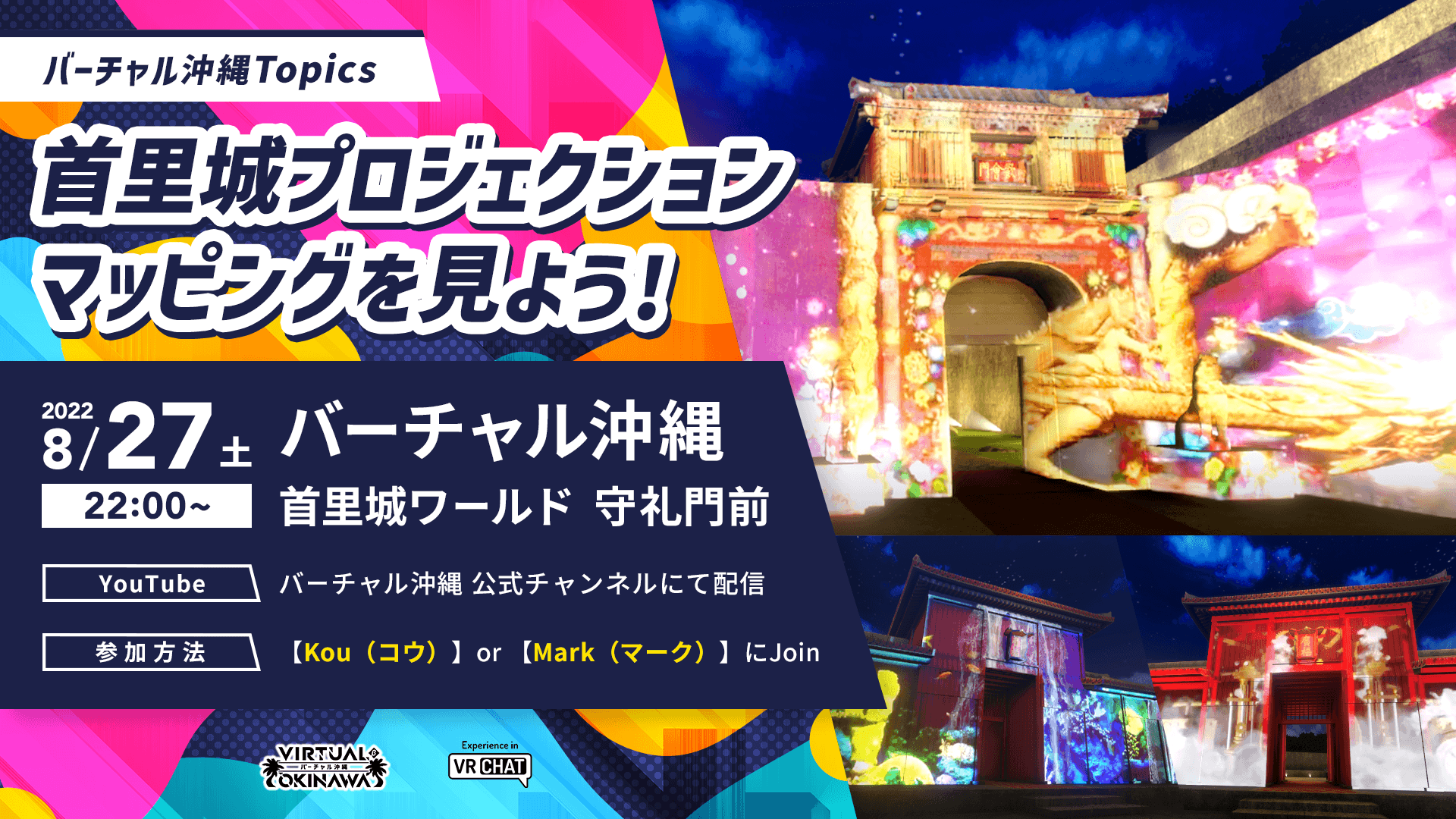 本イベントは、8月27日(土)に首里城エリア歓会門にて上映される首里城プロジェクションマッピングを、バーチャル上でみんなで体験しようというものになっております。