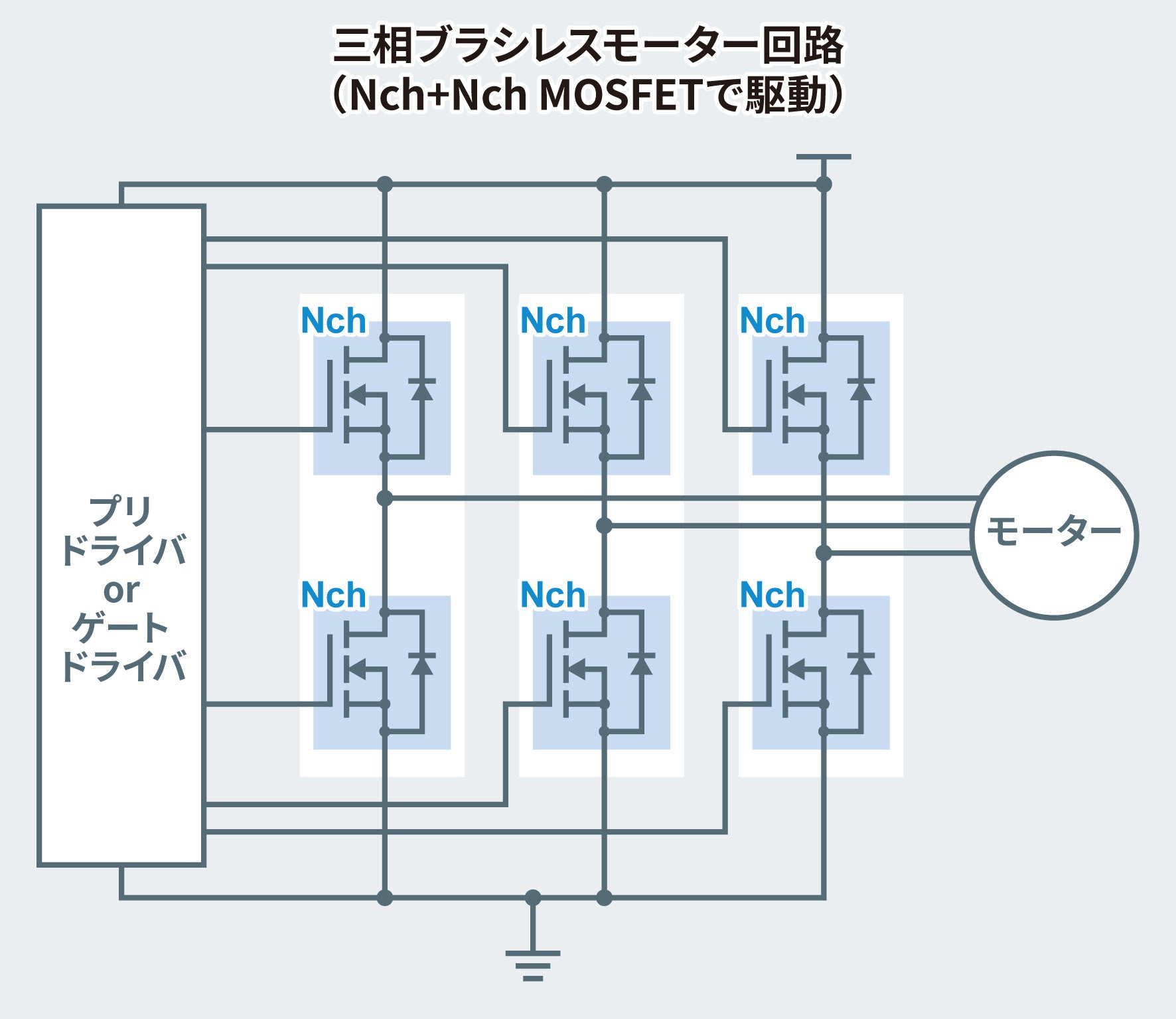 Nch MOSFET:ソースに対してプラスの電圧をゲートに印加すると導通状態になるタイプのMOSFET。Pch MOSFETよりもドレイン-ソース間オン抵抗が小さくなるため、定常損失を減らすことが可能。