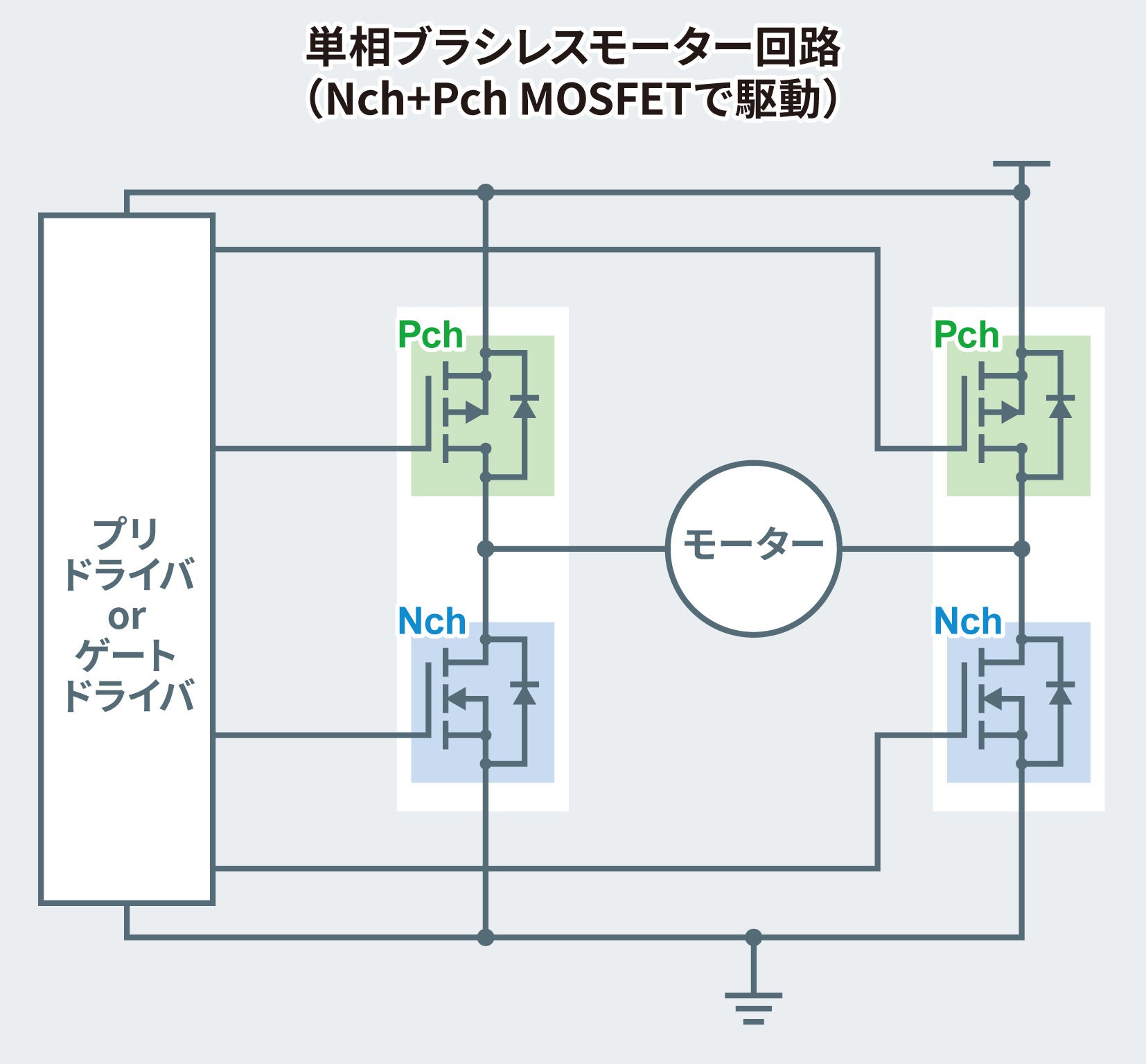 Pch MOSFET:ソースに対してマイナスの電圧をゲートに印加すると導通状態になるタイプのMOSFET。入力電圧より低い電圧で駆動できるため、容易な回路構成が可能。