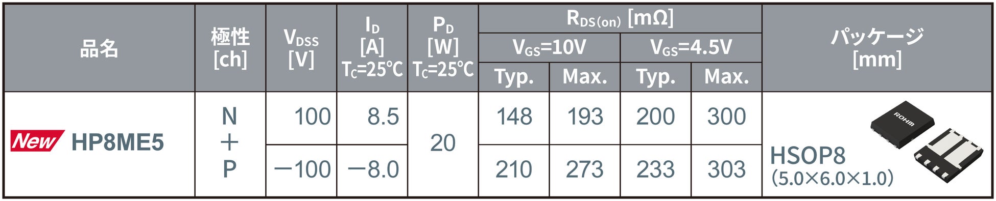 ローム株式会社(本社:京都市)は、通信基地局や産業機器向けファンモーターの駆動に最適な、100V耐圧のMOSFET(*1)2チップを1パッケージに同梱したデュアルMOSFETを開発。「HP8KEx/HT8KEx(Nch+Nch)シリーズ」「HP8MEx(Nch+Pch(*2))シリーズ」として、新たに5機種ラインアップしました。