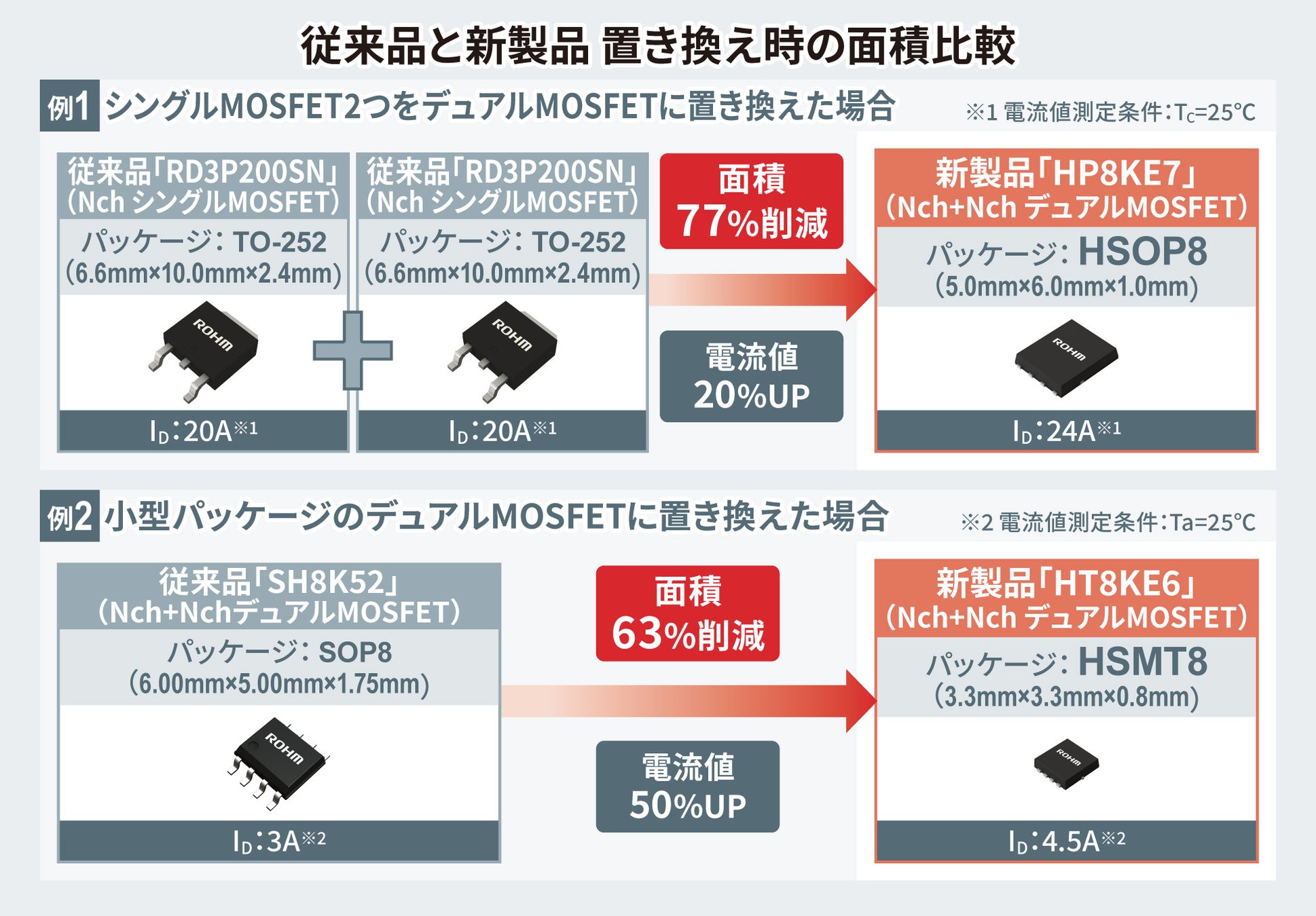 新製品は、ロームの最新プロセスおよび裏面放熱パッケージを採用することで、業界トップの低オン抵抗(Ron)(*3)を達成しました(Nch+Nchの場合、HSOP8で19.6mΩ、HSMT8で57.0mΩ)。一般のデュアルMOSFETと比べてオン抵抗を最大56%低減しており、機器の低消費電力化に大きく貢献します。また、2つのチップを1パッケージに同梱したことで面積を削減でき、機器の省スペース化に寄与します。例えばHSOP8の場合、1チップ内蔵のシングルMOSFET(TO-252)2つから置き換えることが可能なため、面積を77%削減できます。