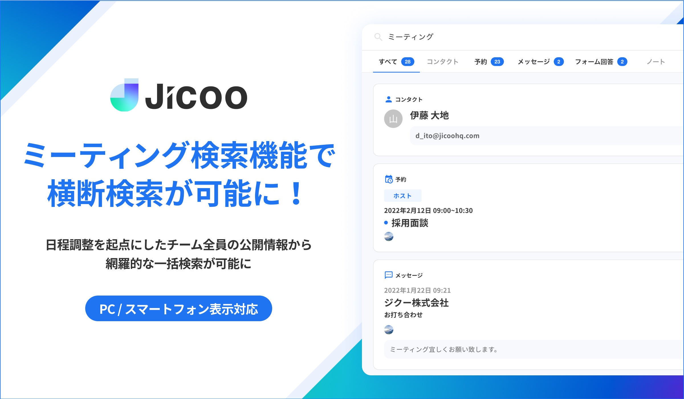 日程調整ツール「Jicoo」を運営するジクー株式会社(本社:東京都台東区、代表取締役社長:鈴木真一郎、以下「Jicoo」)は、日程調整した予定の参加者、議事録、メールのやりとり、フォーム回答、タスクなど実施したミーティングに関する情報すべてを対象にした横断&一括検索が可能なミーティング検索機能の提供を開始しました。