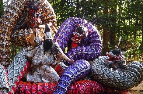 (子どもたちが体験する神楽舞(イメージ)と講師により舞われるヤマタノオロチ舞、竹工芸で制作する盛りかご)