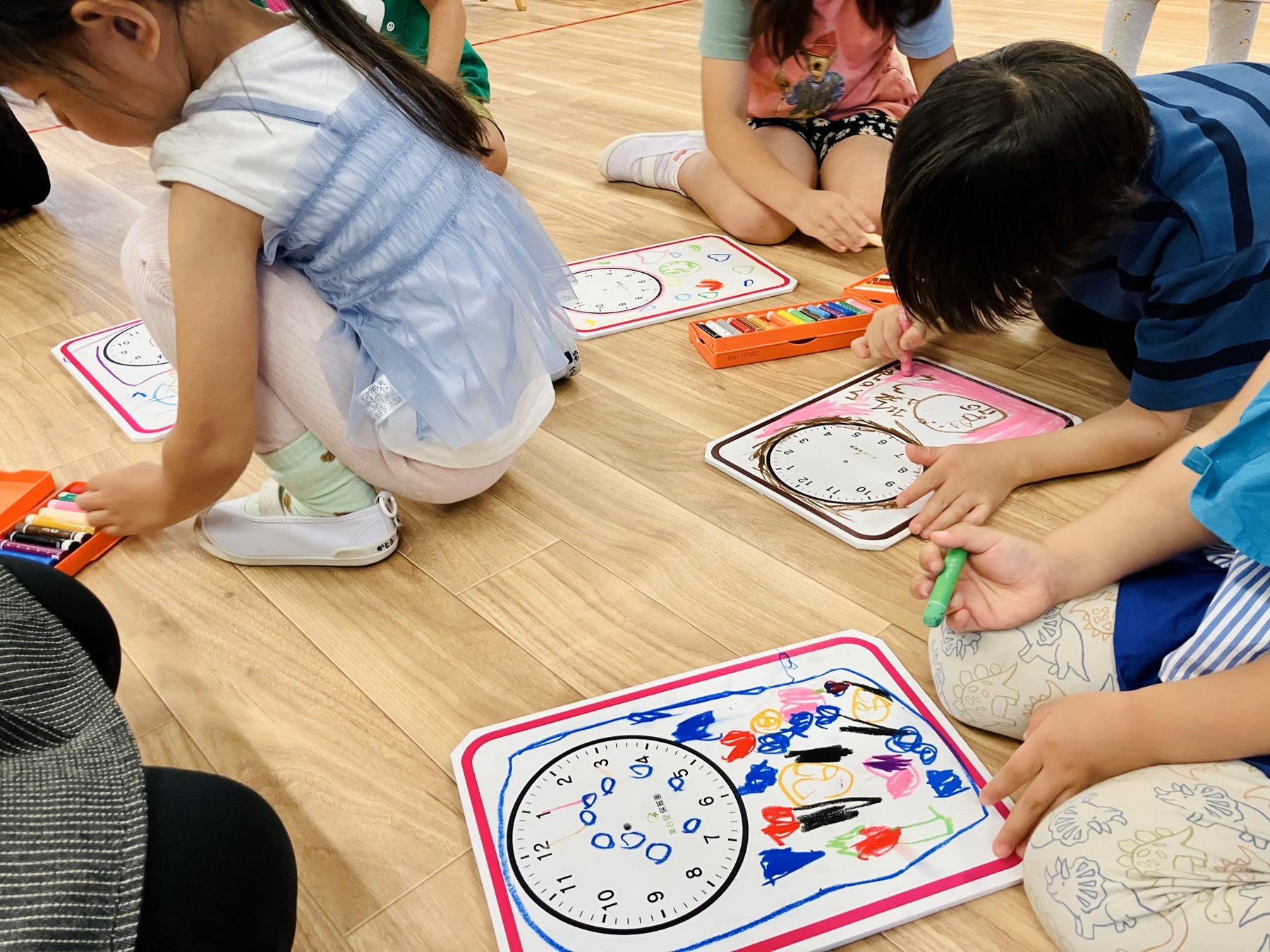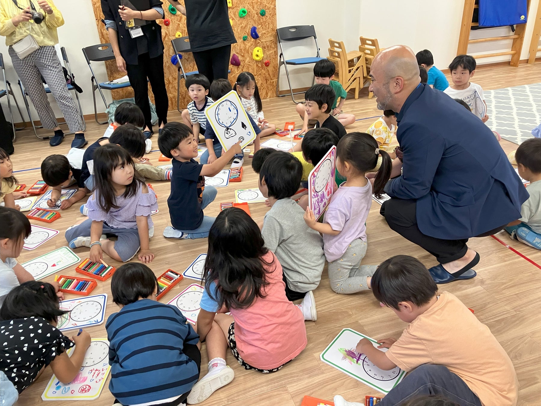 お絵かき時計のワークショップでは、時計の文字盤が印刷された台紙に、園児たちがオイルパステルで自由にお絵かきをした後、そこに針を取り付けて実際に時計の針が動く様子を見ることができる時計の工作に挑戦。自由な発想で描いた絵を組み合わせた世界に一つだけの時計を作るため、一生懸命にお絵かきをしました。針を取り付けてもらうと出来上がった作品を持って「みて!みて!」と自慢げに見せたり、時計の針を動かして楽しんでいました。