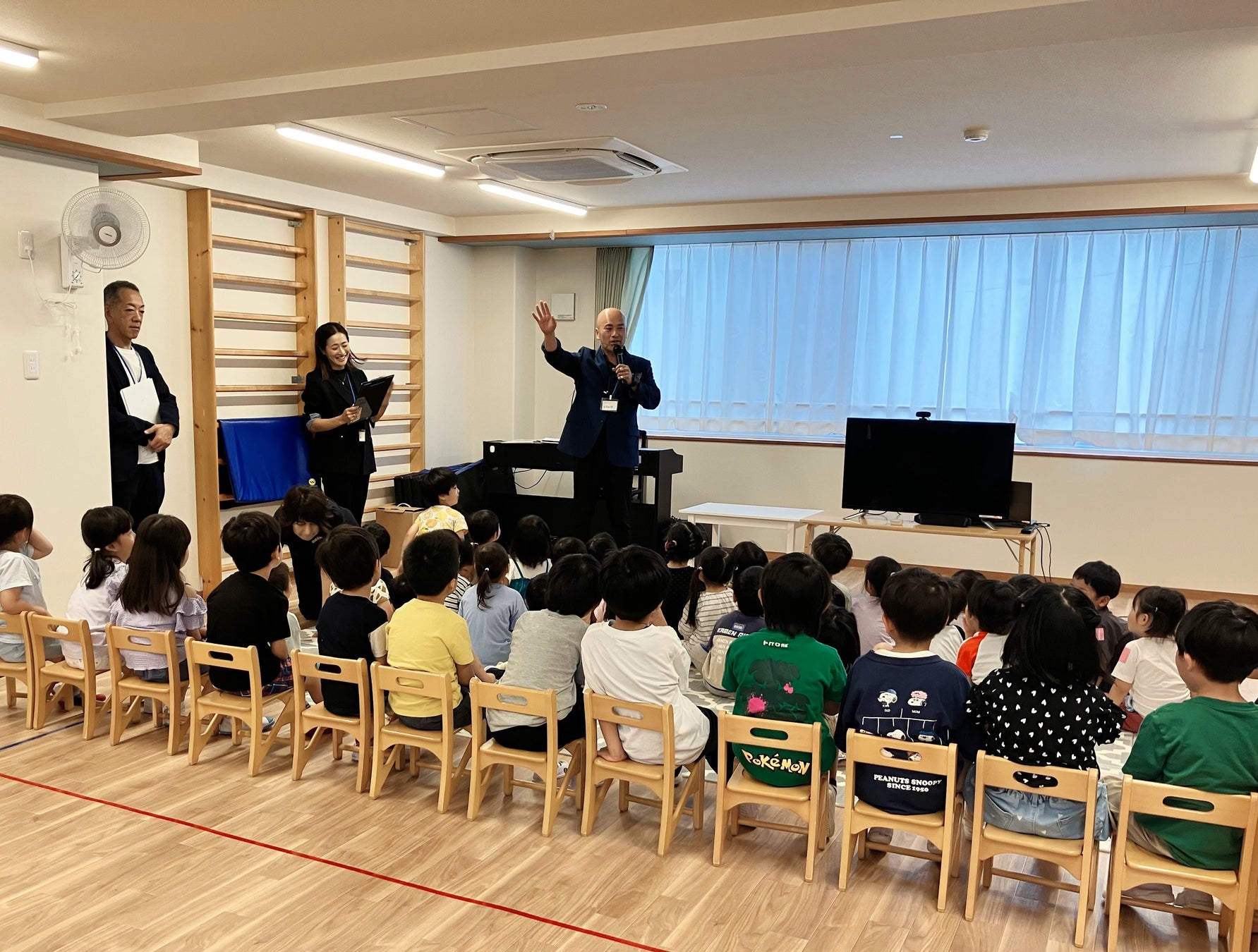 当日は、3~5歳時の園児45人が参加。はじめに、東海時計商事株式会社 代表取締役社長 石黒 嗣英より開会の挨拶を行い、「みんなで楽しくたくさん時計のお勉強をしよう!」と会場の園児たちに向けて語りました。