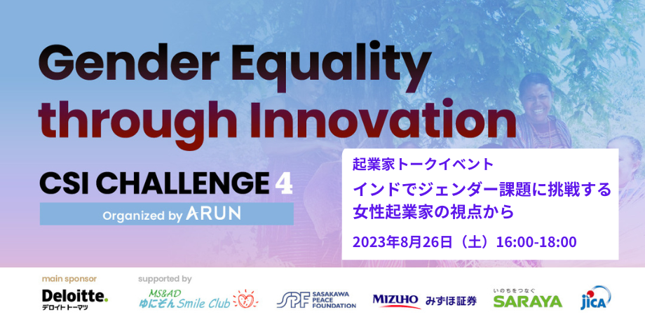 2023年8月26日土曜日16:00-18:00、ARUN がオンライントークイベント、「インドでジェンダー課題に挑戦する。女性起業家の視点から。」を開催します。
