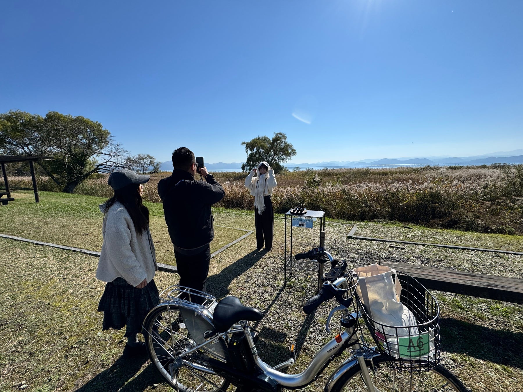 サイクリングの途中では、猪苗代湖と磐梯山の雄大な景色が目の前に広がり、思わず息をのむ瞬間が何度も訪れました。秋の柔らかな光が湖面に反射し、山々の紅葉と相まって、まるで絵画の中を走っているかのような感覚に。台湾インフルエンサーたちはその美しさに魅了され、あちこちで立ち止まり、たくさんの写真を撮影して思い出を心に刻みました。