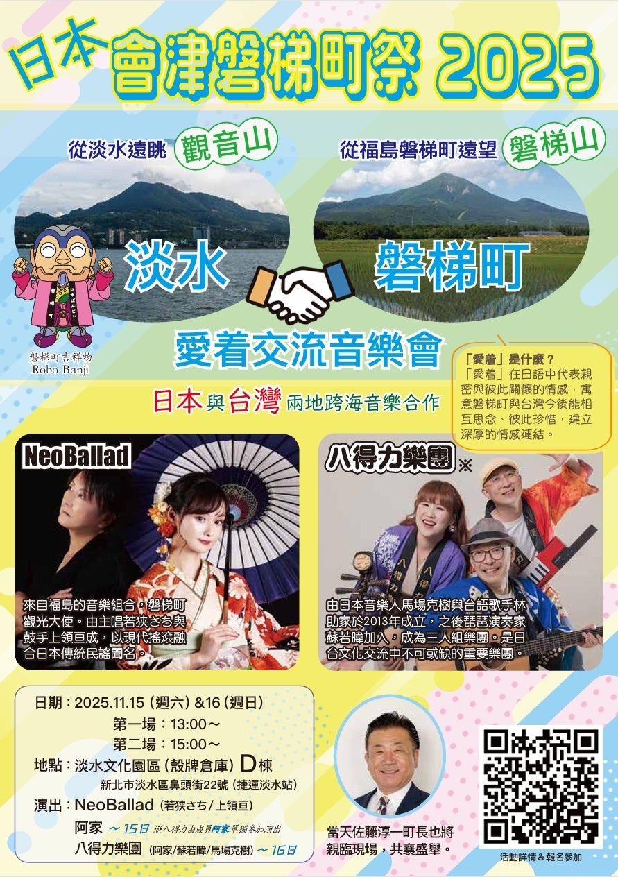 この度、日本の福島県磐梯町と台湾の友好の証として、音楽イベント「日本会津磐梯町祭 2025 愛着交流音楽会」を11月15日(土)・16日(日)に開催する運びとなりました。「愛着」という言葉に込められた、互いを想い、大切にする心をテーマに、磐梯町観光大使「NeoBallad」と、日台混合ユニット「八得力樂團」が情熱的なパフォーマンスを繰り広げます。日本の伝統民謡と現代ロック、そして台湾語の歌声が交差する、ここでしか体験できない感動のステージにご期待ください。