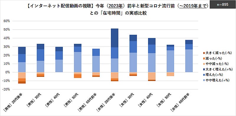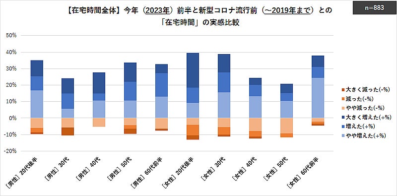プラス(増えた)方向の割合では、高い方から順に「女性-20代後半(51.2%)」「女性-30代(43.8%)」「女性-40代(40.0%)」と、在宅時間全体よりも「女性-若年世代」で高くなる傾向にあり、特に「女性-20代後半」では、他年代より「大きく増えた」の割合もかなり高くなっていた。