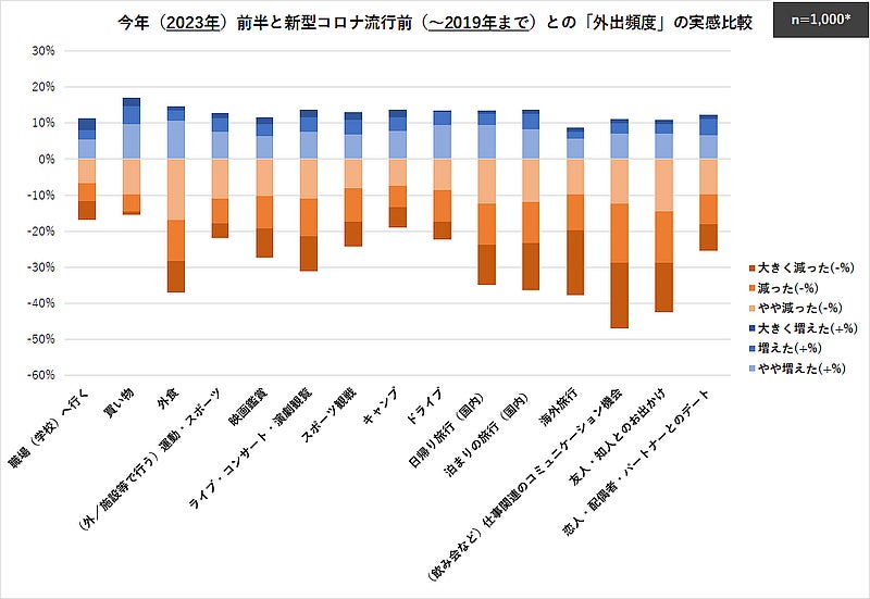 今回の調査では、25歳から64歳の男女計1,000人を対象として、今年(2023年)前半と、新型コロナ流行前(~2019年まで)の同じ頃を比較してもらう形で、在宅時間・外出頻度の変化をどのように感じるか?を聞く質問を行った。