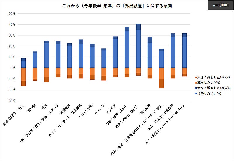 外出頻度の中で、これから増やしたいとの回答が多かった項目は、「泊まりの旅行(国内)」「日帰り旅行(国内)」。減らしたいとの回答が上回ったのは、「職場(学校)へ行く」。