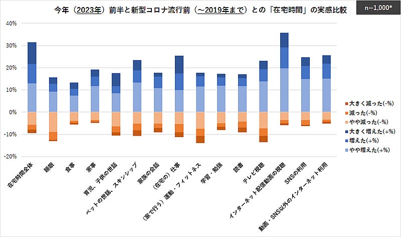 個別の項目では、プラス方向の割合で「インターネット配信動画の視聴(35.8%)」が他の項目に10ポイント以上の差をつけて高く、続いて「動画・SNS以外のインターネット利用(25.5%)」「(在宅の)仕事(25.4%)」となっている。