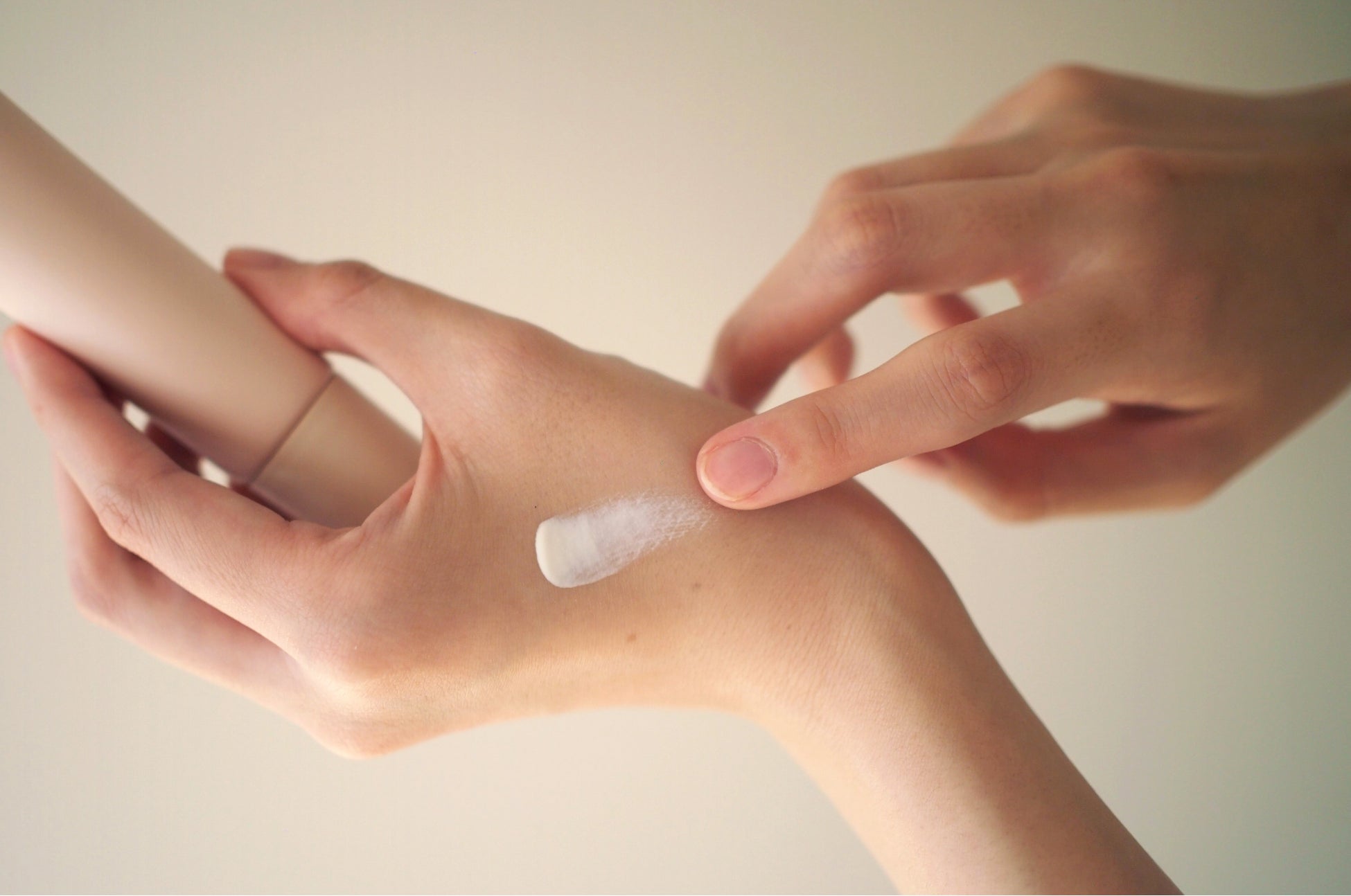 1.パール粒大を手にとり、額、両頬、鼻の上、あごに置き、顔の中心から外側へ指を広く使って均一にのばします。