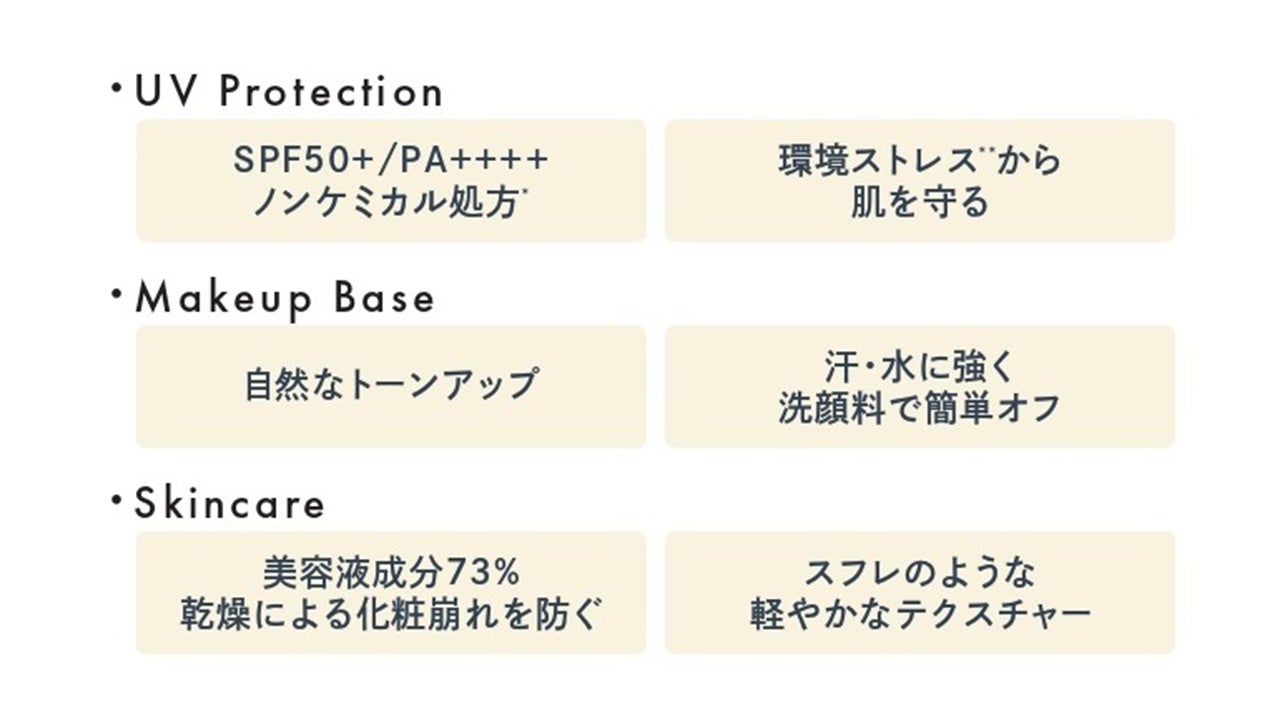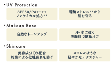 - 1本でUVプロテクト・化粧下地・スキンケアの3役。
