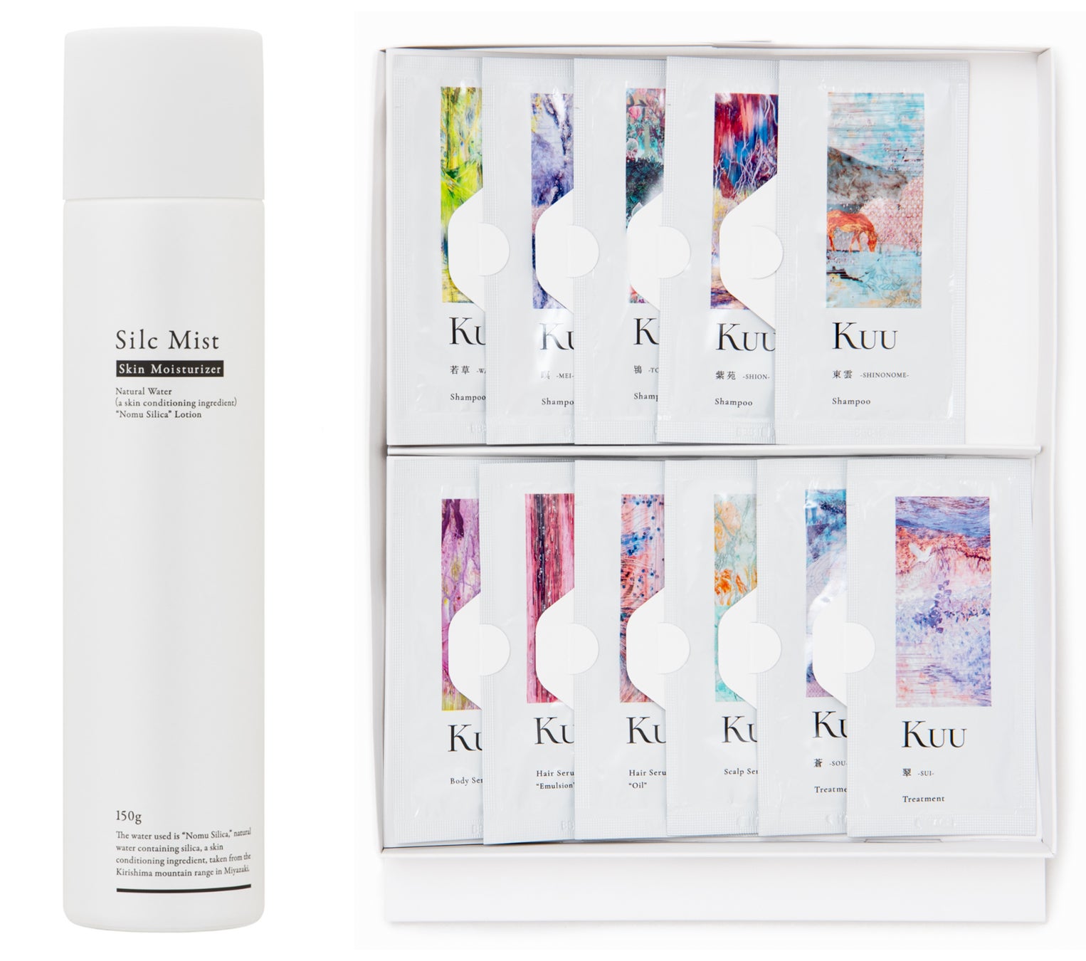 さらに、当日「のむシリカ」公式Twitterアカウント(@nomusilica)をフォロー&リツイートしていただくと、抽選で「のむシリカ」を化粧水にした「シルクミスト」、または、一滴の水も含まない*、高級ヘッドスパサロン発ヘアケアシリーズ「Kuu Aqua free series」ギフトボックスがもらえるキャンペーンを開催します。