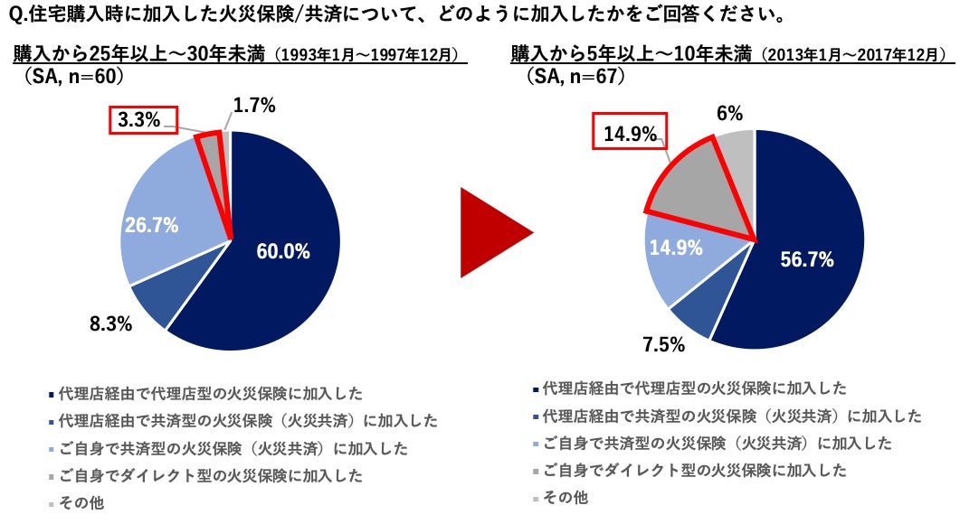住宅購入時期を[購入から25年以上〜30年未満(1993年1月〜1997年12月)]と[購入から5年以上〜10年未満(2013年1月〜2017年12月)]で比較すると、ダイレクト型の加入率が約5倍に増加(3.3%→14.9%)していることが判明。お住まいの地域のリスクに合わせた補償内容など自身で選択できるダイレクト型の需要が高まっていることが窺える。