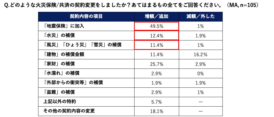 火災保険の加入先や契約内容を変更した人のうち、約半数(49.5%)の人が地震保険に加入したと回答。また「水災」を外した人が1.9%なのに対して12.4%の人が追加、同様に「風災、ひょう災、雪災」を外した人が1%に対して、追加した人は11.4%という結果になりました。変更の理由を伺うと、「地震が怖かったから」や「自然災害が増えている為」、「最近、地震が多いから」などの回答があり、近年の自然災害の増加により危機意識が高まっていることが窺えます。