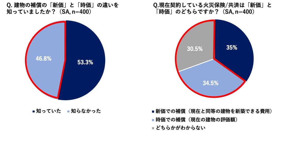 ・全体の約半数(46.8%)が火災保険や共済の建物の補償には「新価」と「時価」があることを知らないと回答。