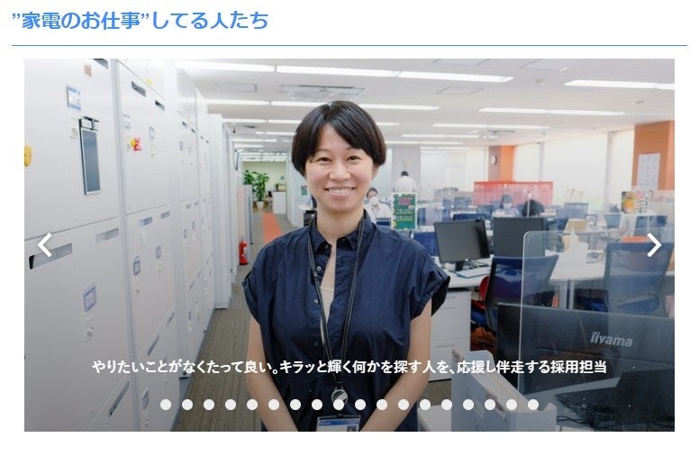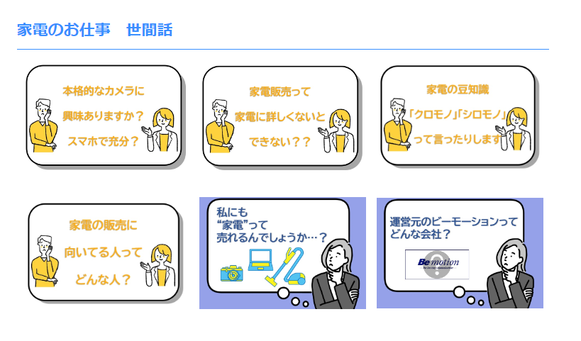 リアルな仕事内容と職場環境を知ってもらうことで入社後のギャップを防ぎ、ミスマッチのないお仕事の選択につなげるため、家電業界で働くスタッフへのインタビュー記事や、家電販売におけるお役立ち情報をコラム形式で掲載しています。コラムを通じて実体験ストーリーを追体験していただくことで、新たなチャレンジの後押しになればと考えております。