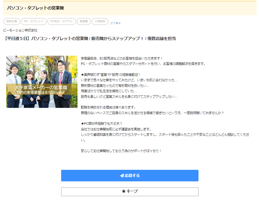 未経験者から経験者まで幅広く活躍できる求人情報を数多く取り揃えており、こだわりの希望条件から最適な求人情報を検索できます。店頭販売職だけでなく、家電量販店を巡回してセールスサポートをする営業職(ラウンダー)の求人も掲載しており、店頭販売の経験を活かした別職種へのチャレンジもサポートしています。