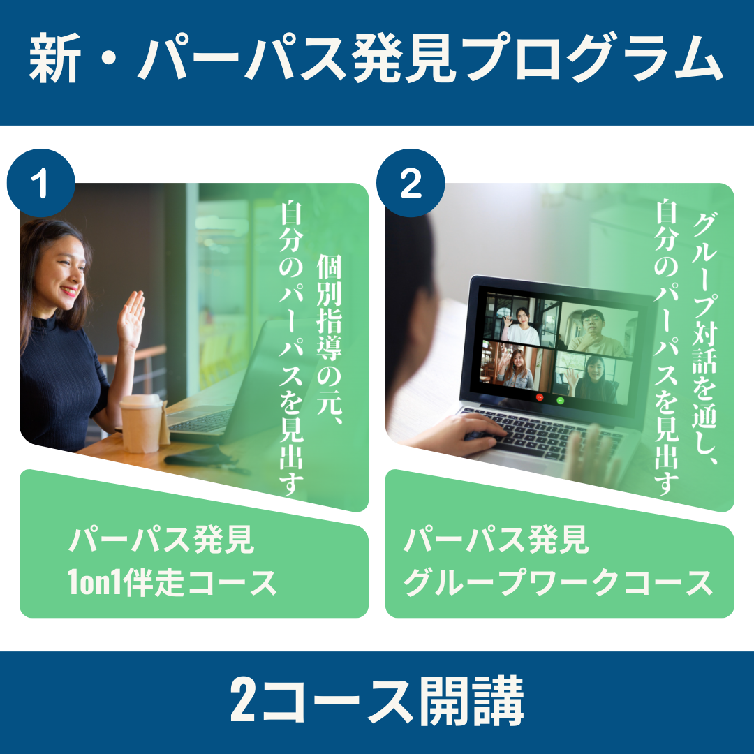 以上が「パーパス発見1on1伴走コース」と「パーパス発見グループワークコース」のプログラム概要となります。