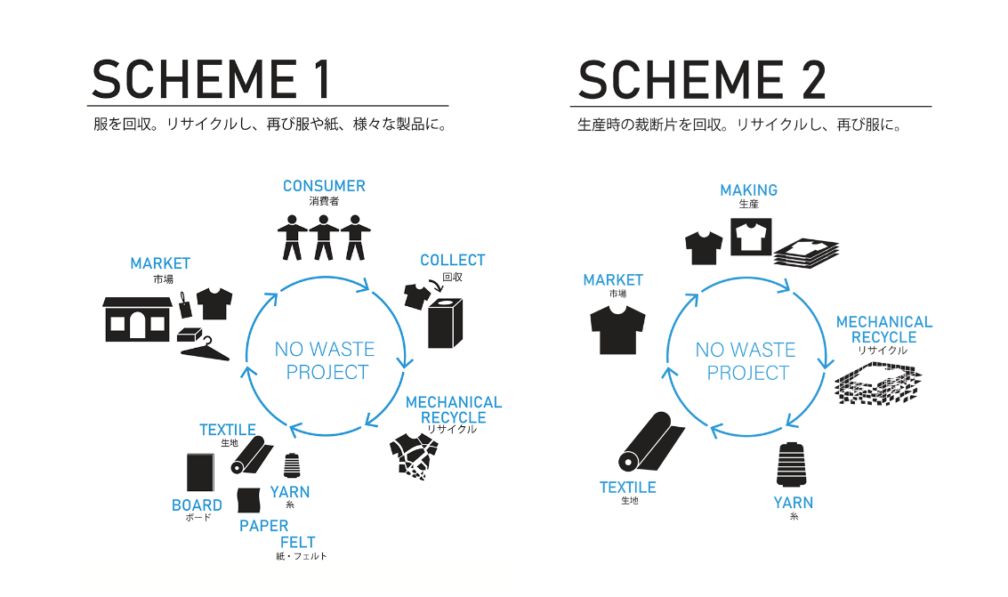 また、「全て無駄にしない」をコンセプトにした独自の素材循環スキーム「NO WASTE PROJECT」により、廃棄されるサンプルなどの衣類を細かく粉砕、繊維状にしたものを牛乳パックなどの古紙に混ぜ込んだリサイクルペーパー(混抄紙)が、学生デザインの文化祭各種チケットの素材として使用されています。
