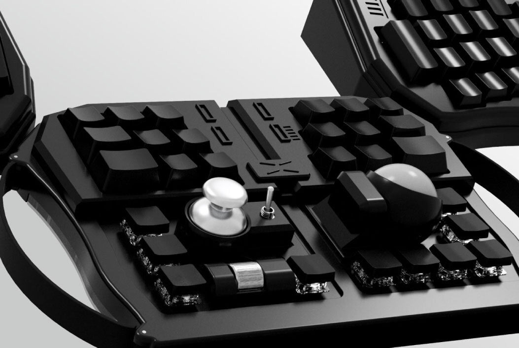 AR・VRとの親和性も高いことが特長で、マウス操作や特殊キーの親指操作、背面では四指でのキー操作を実現しています。キーレイアウトやキーの高さ、ライトの色などのカスタマイズが可能で、トグルスイッチ、トラックボール、ジョイスティックを搭載した独自のデザインが特徴です。