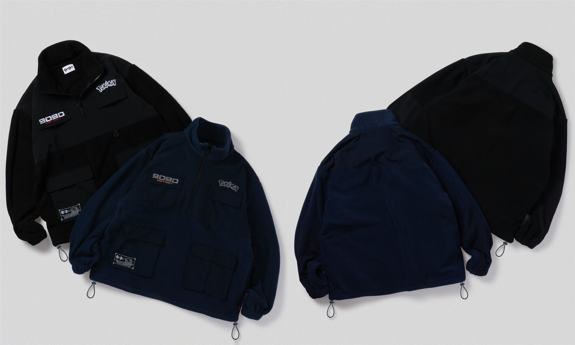 フリース・ナイロン生地を用いたハーフジップフリース。フロントポケット、裾のドローコードなど機能性に優れた一着。Pokémon ロゴ、9090 ロゴはそ れぞれ刺繍で施し、右下ポケットのタグ、身頃のピスネームはそれぞれ Pokémon コレクション仕様となっている。
