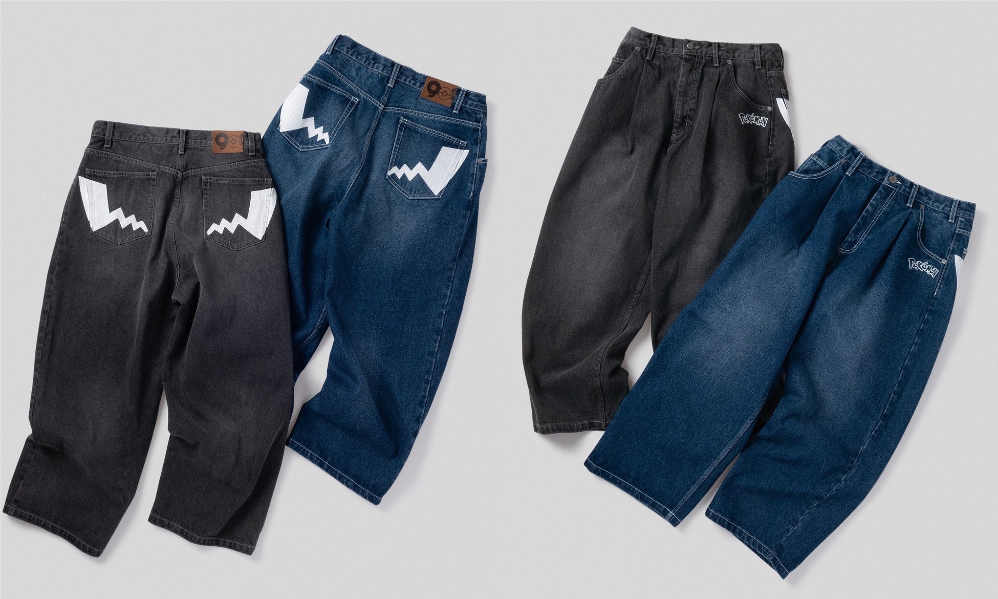 ピカチュウの尻尾をバックポケットにプリントしたワイドシルエットのデニムパンツ。フロントには Pokémon ロゴが刺繍され、革パッチは Pokémon コ レクションオリジナル仕様に。