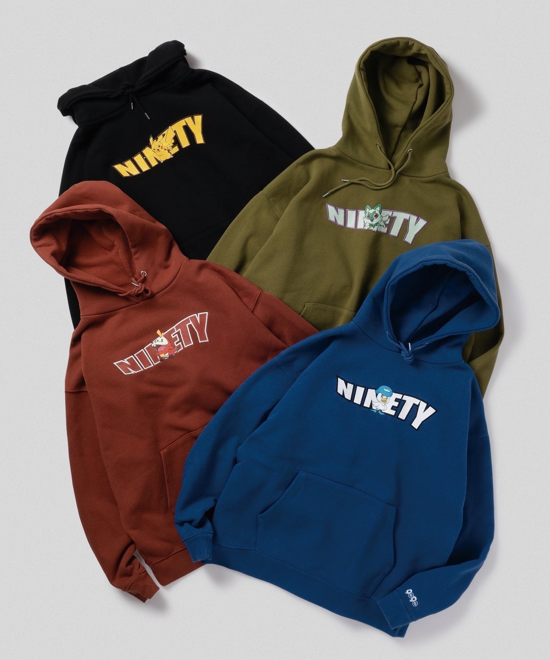 新ポケモンのホゲータと NINETY を刺繍とプリントで表現したフーディー。フード部分には Pokémon ロゴ、左袖口には 9090 ロゴとモンスターボールを 組み合わせた Pokémon コレクションロゴが刺繍で表現されている。
