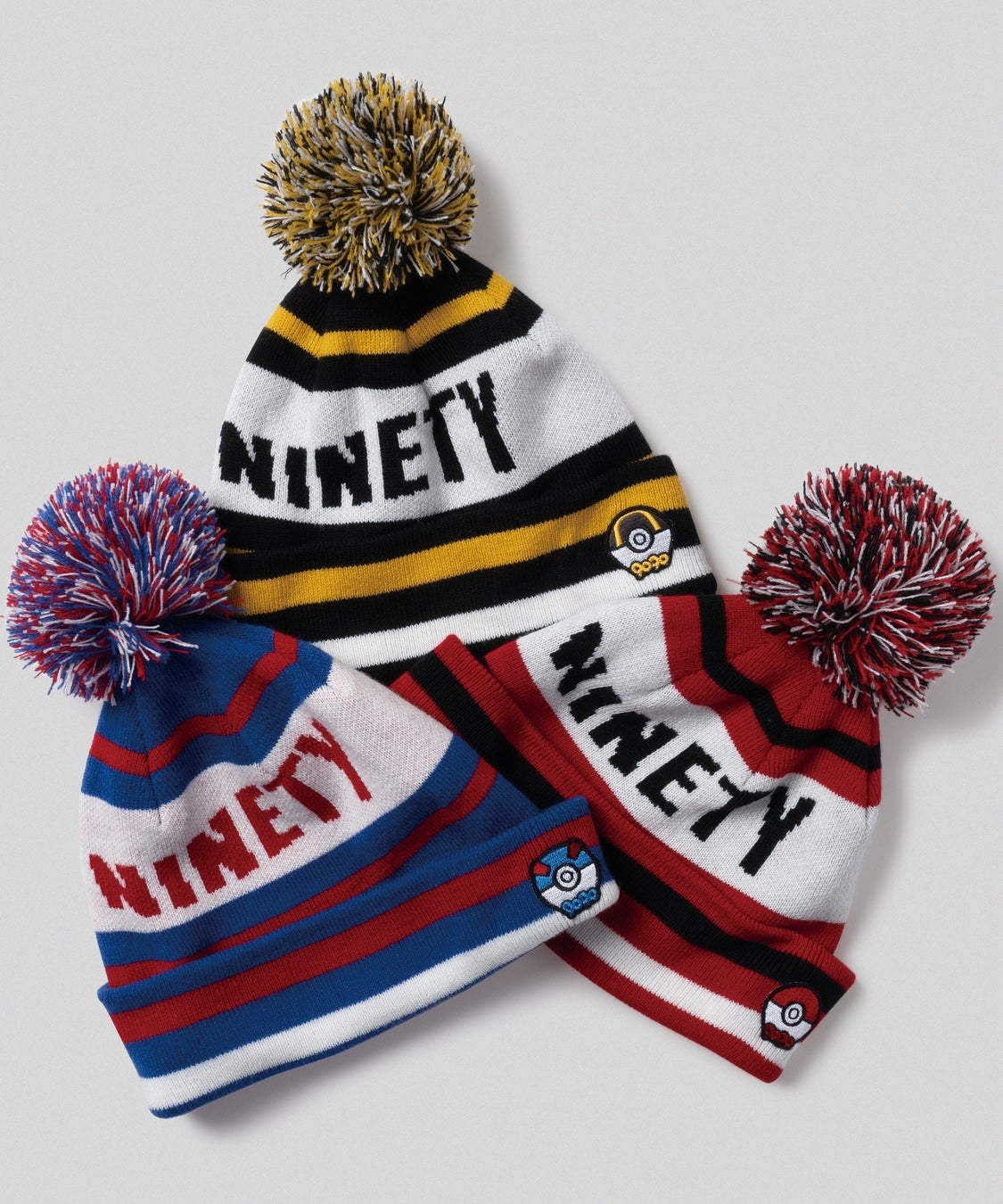 モンスターボール・スーパーボール・ハイパーボールのカラーをニットキャップのカラーで表現。 それぞれオリジナルデザインのワッペンが配されている。