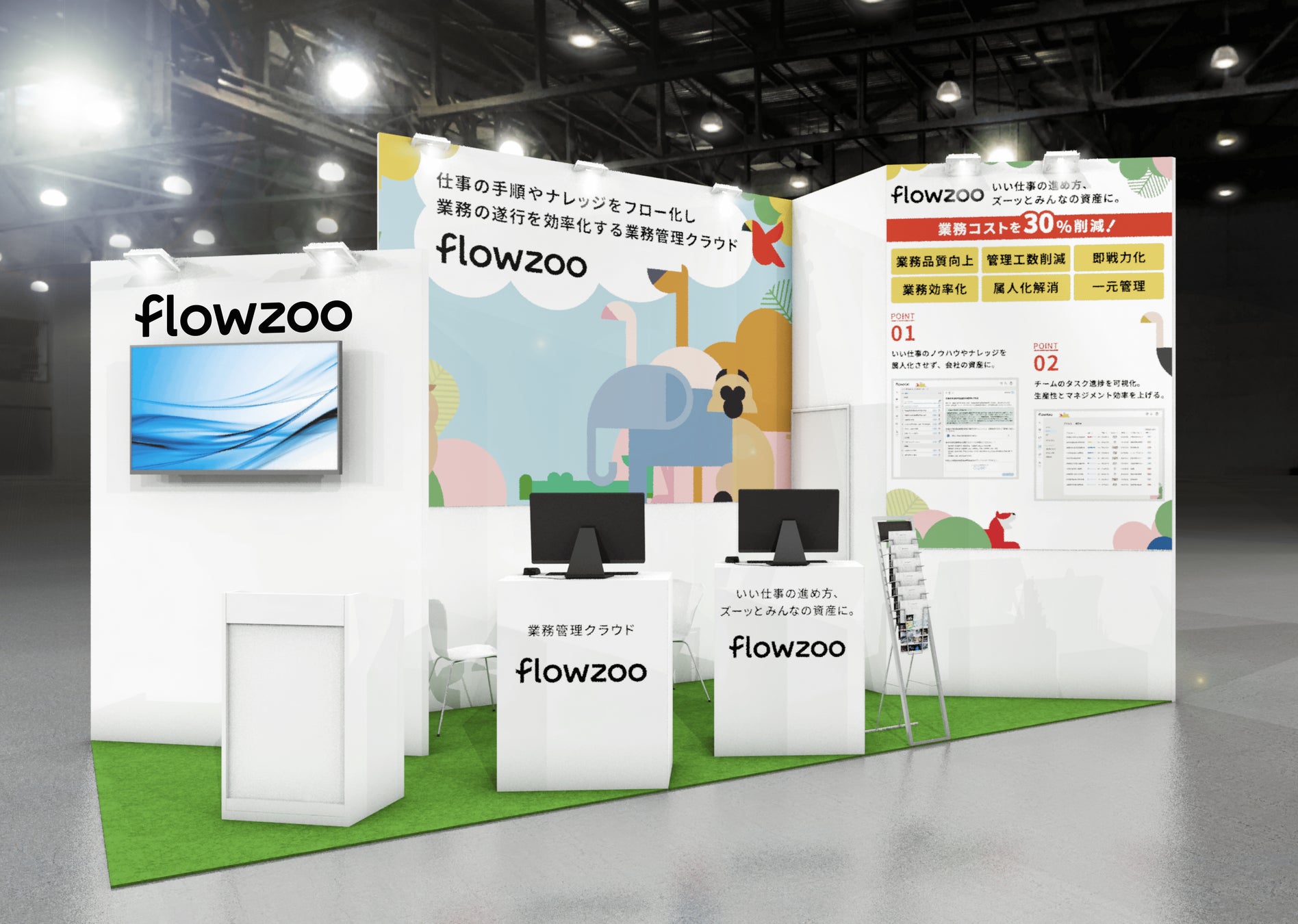 当社は、管理職の負担を軽減し組織の生産性を向上させる業務管理クラウド「flowzoo(フローズー)」の展示を行います。展示会会場では「flowzoo」の実際の画面を見ながらデモ体験が可能です。サービスの詳細をご説明し、お客様の課題にあわせた導入・運用についてご相談を承ります。