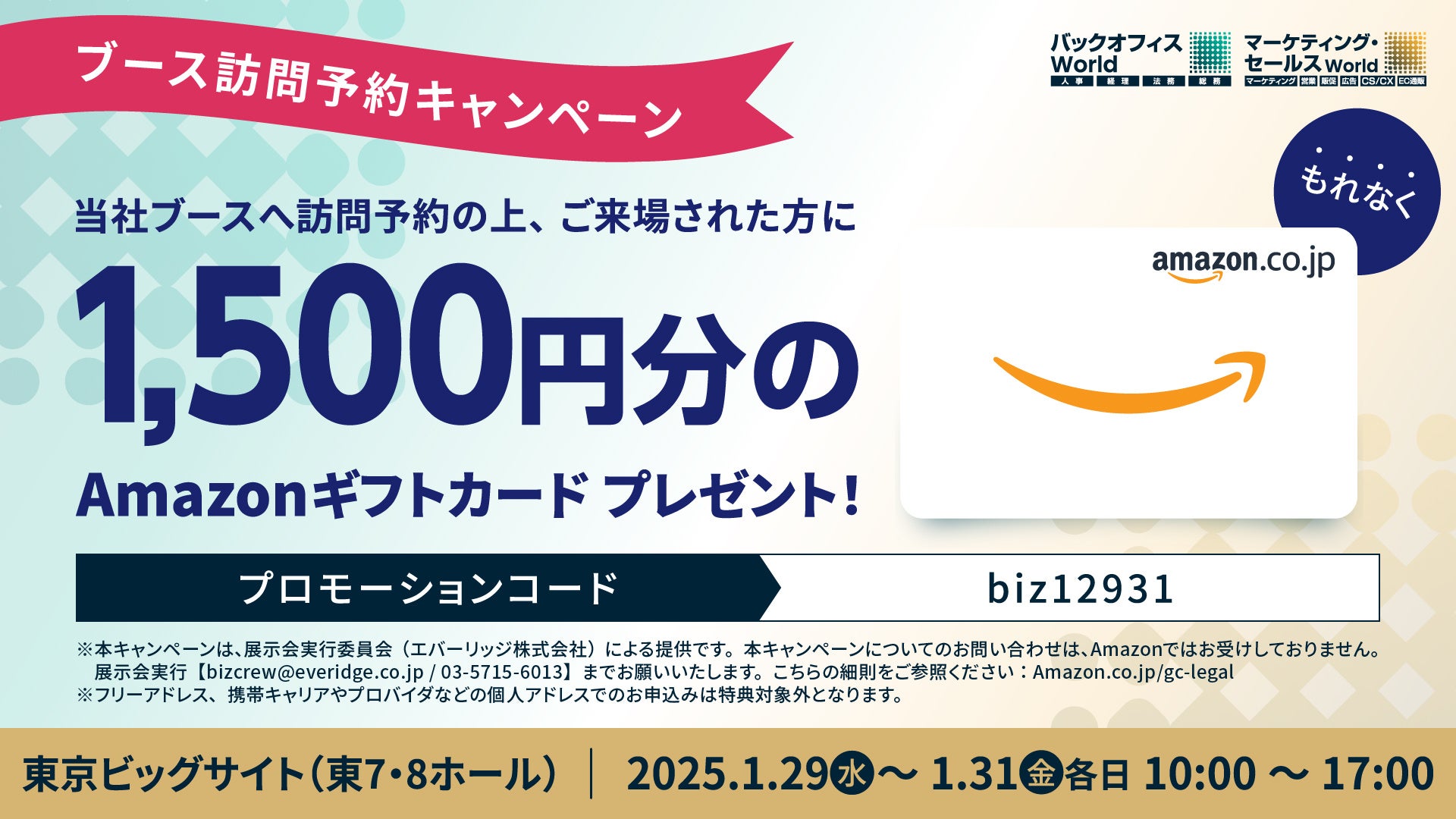 ※プロモーションコードのご入力、ブース訪問予約、および当日のアポイント実施でAmazonギフトカード(1,500円分)をもれなく進呈します。